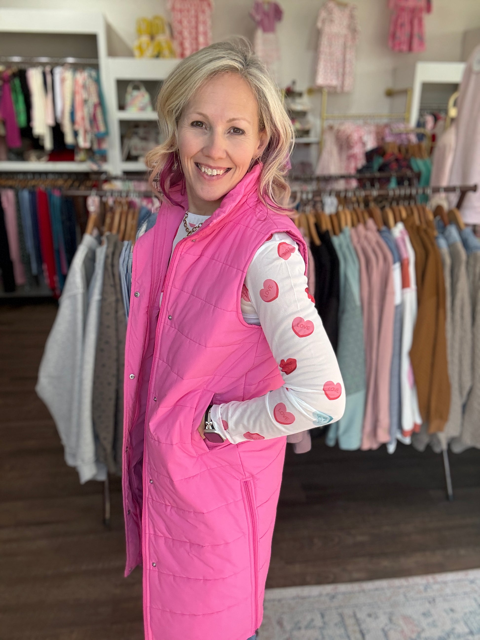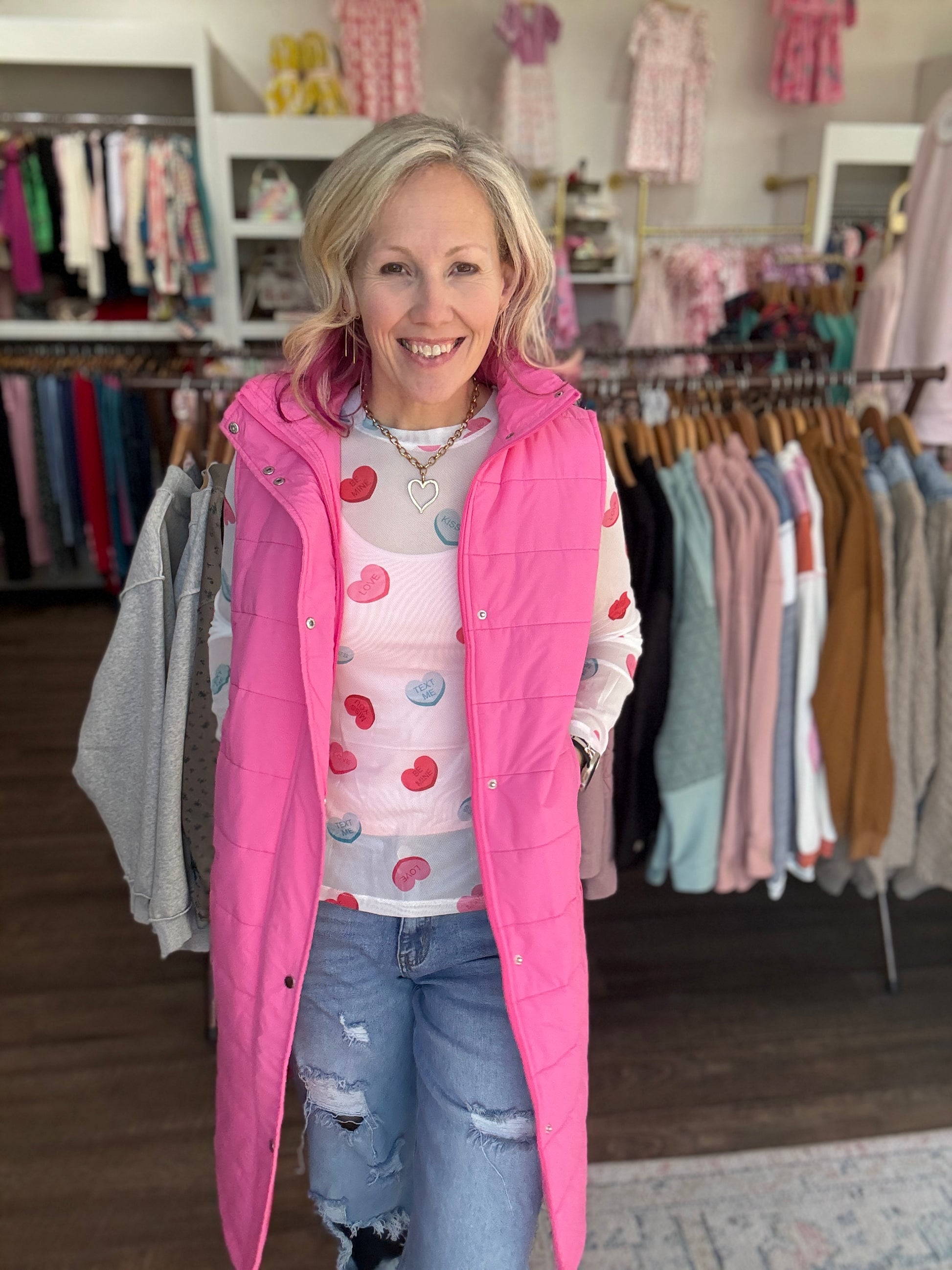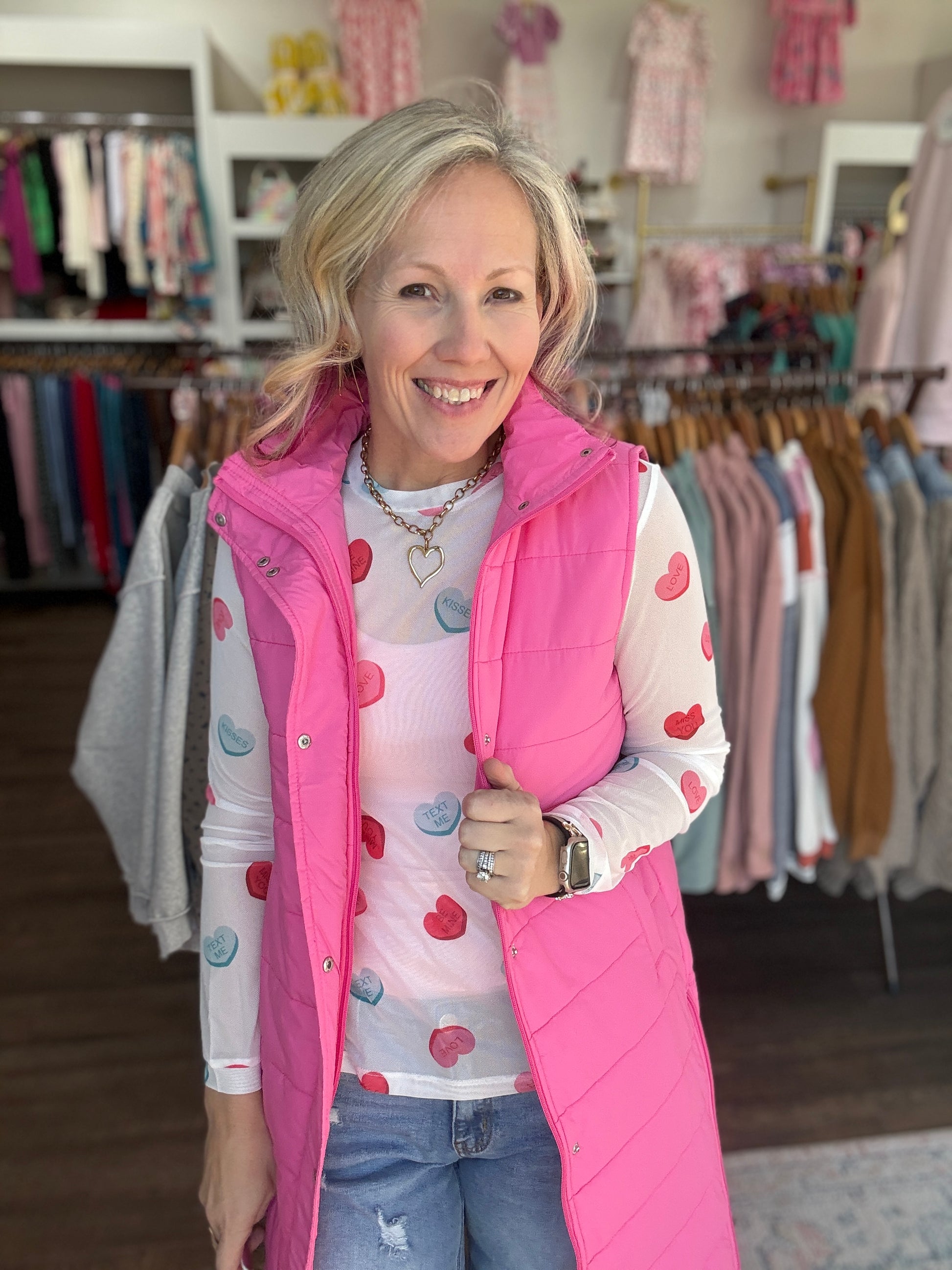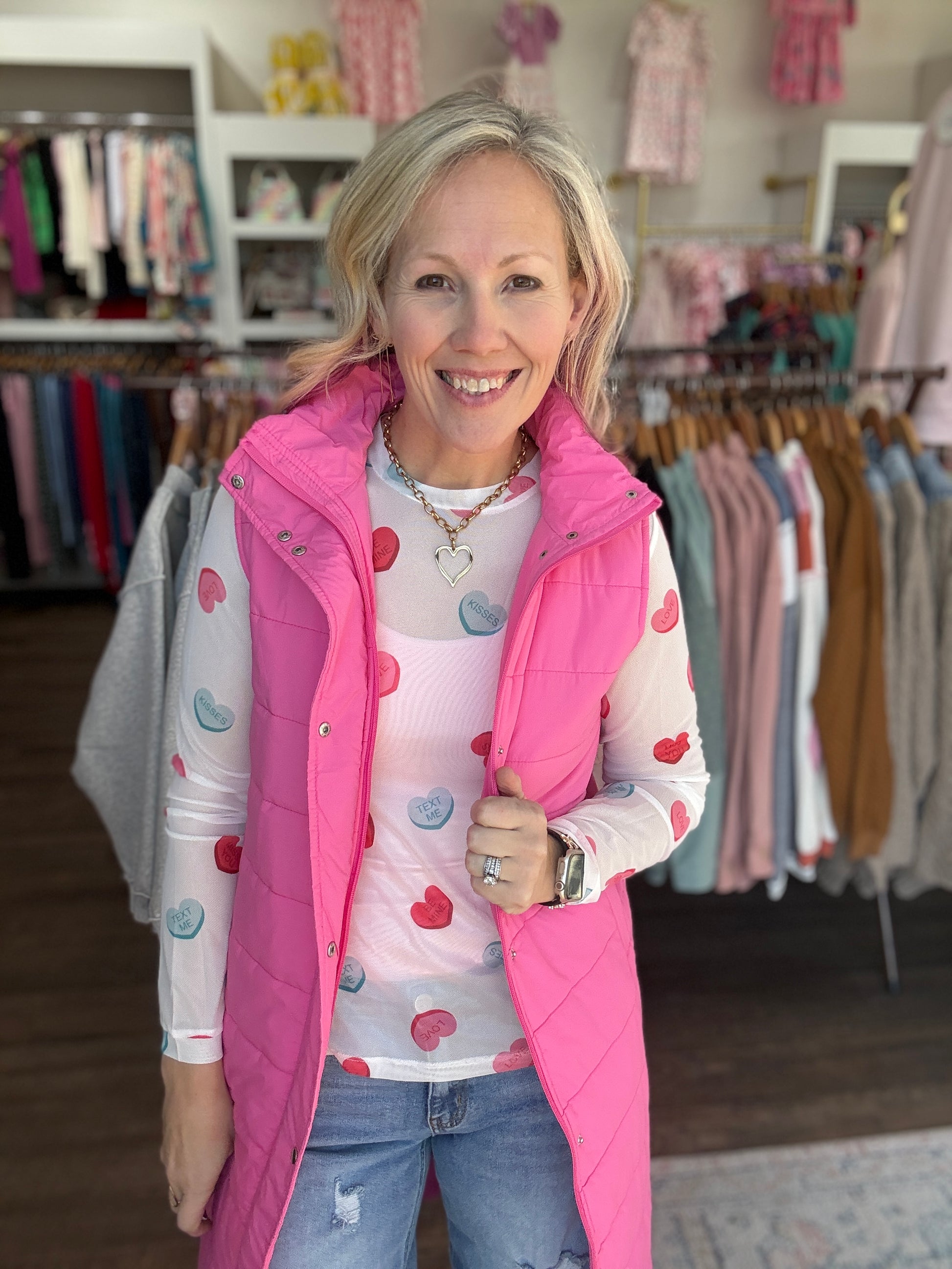 Add a flirty pop to your Valentine’s looks with the Sweethearts Mesh Layering Top. This sheer white mesh top is sprinkled with red, pink, and light blue hearts for the prettiest playful vibe that’s made for layering.