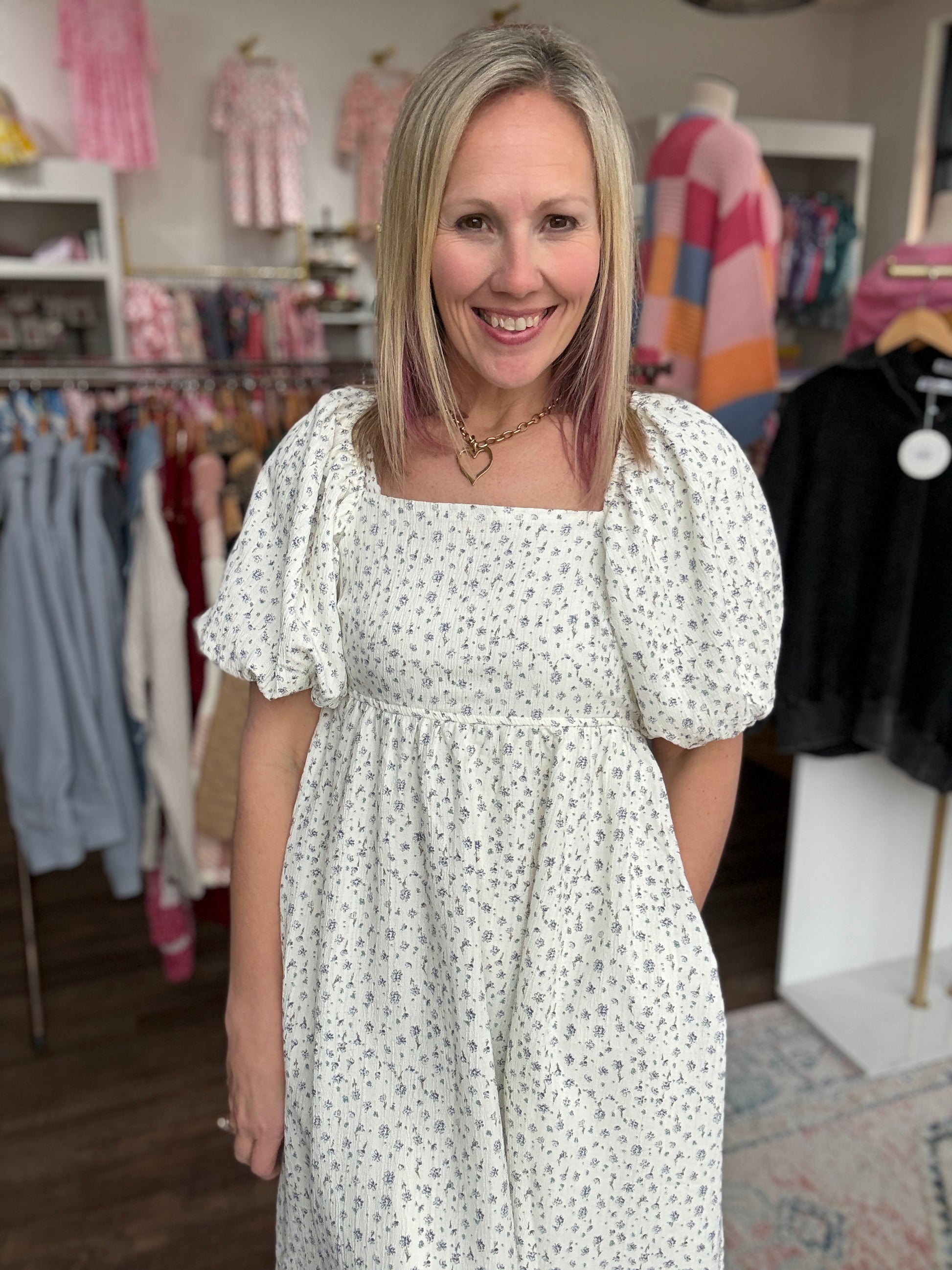 The square neckline and subtle puff sleeves add a romantic touch, while hidden pockets make it as practical as it is beautiful. Perfect for spring events, brunch dates, or everyday boutique style — just add sandals or sneakers and go.
