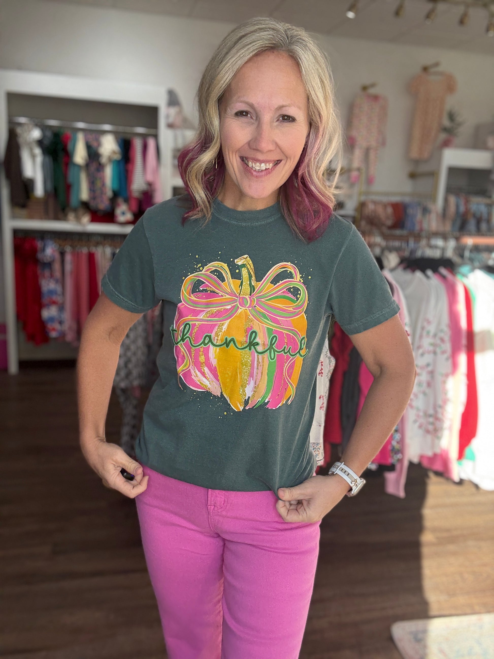 Add a splash of autumn joy with the Colorful Thankful Pumpkin Graphic Tee! This playful tee showcases a vibrant pumpkin bursting with gratitude, perfect for celebrating the season in style. Soft and comfortable, it’s your go-to shirt for cozy fall days, family gatherings, or spreading thankful vibes wherever you wander. Embrace the colors of the season and wear your gratitude proudly! Comfort Colors
