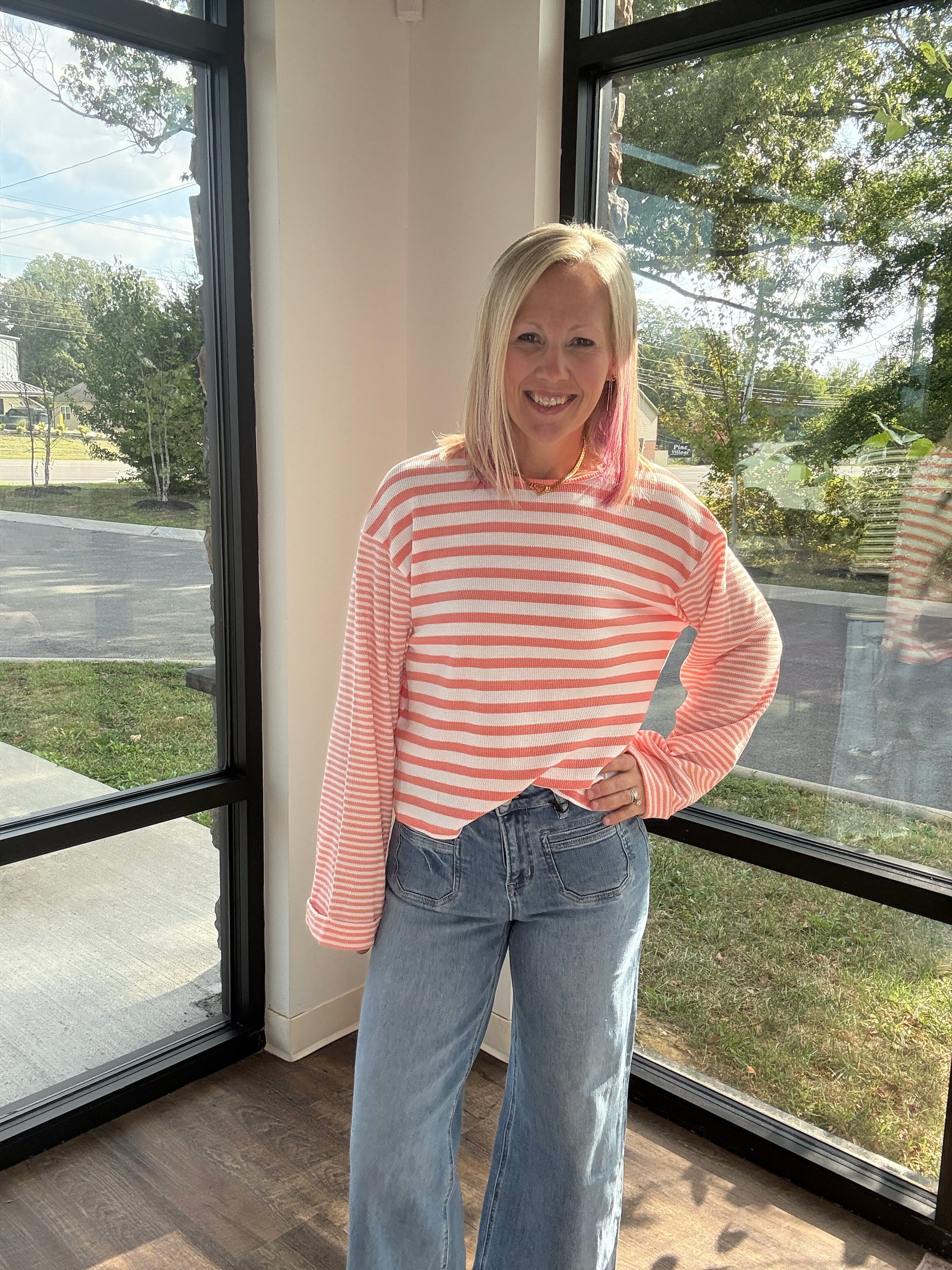 A classic with a twist — the The Belle Textured Stripe Long Sleeve Top is all about easy style and subtle detail. Featuring a soft textured stripe fabric and a flattering relaxed fit, this top gets a modern upgrade with a slight bell sleeve at the wrist for just the right amount of flair. Effortless to dress up or down, it’s perfect with jeans for a casual day out or tucked into trousers for a chic, elevated look. Comfortable, versatile, and anything but basic — this is the stripe you’ll keep reaching for.