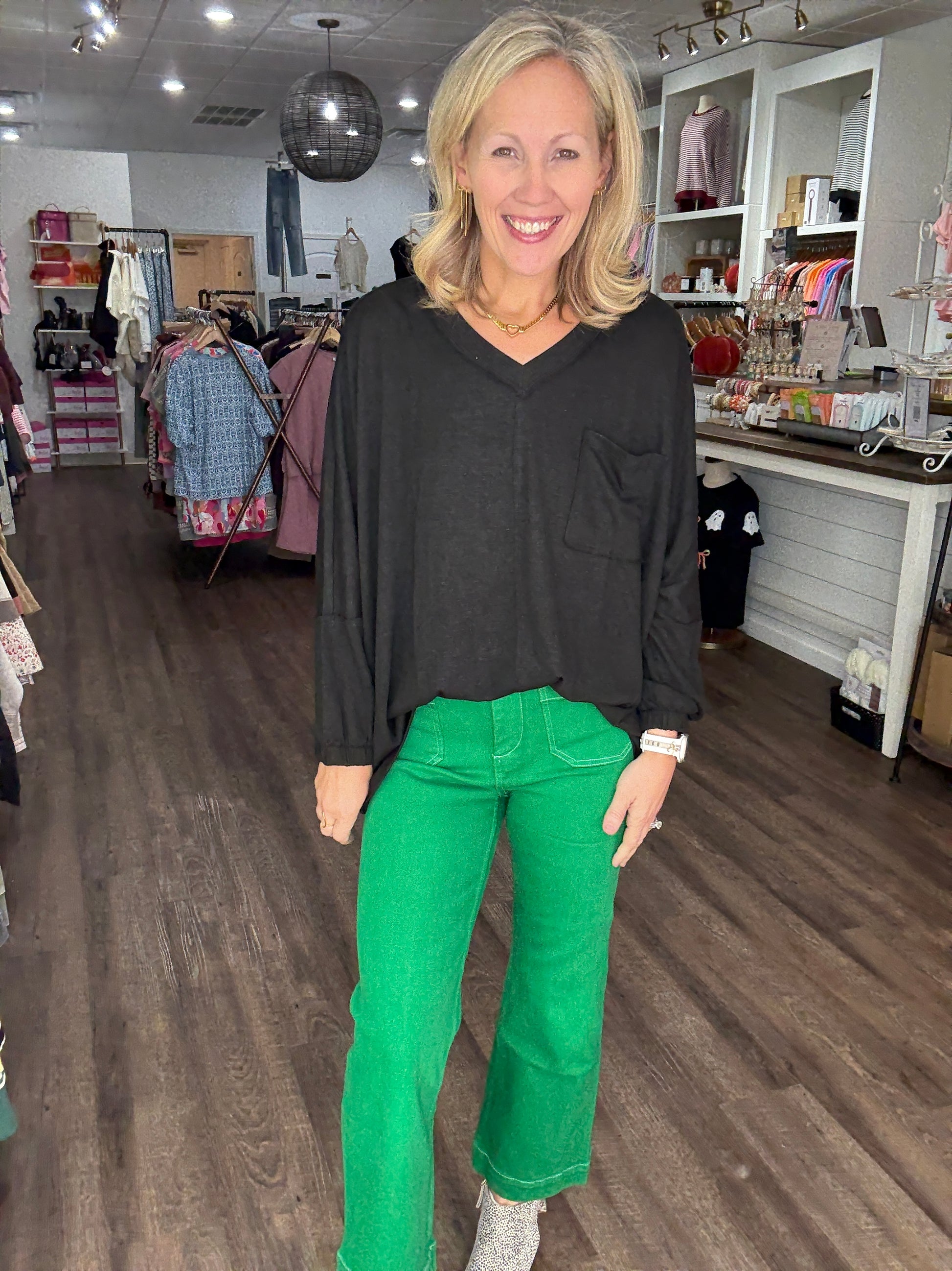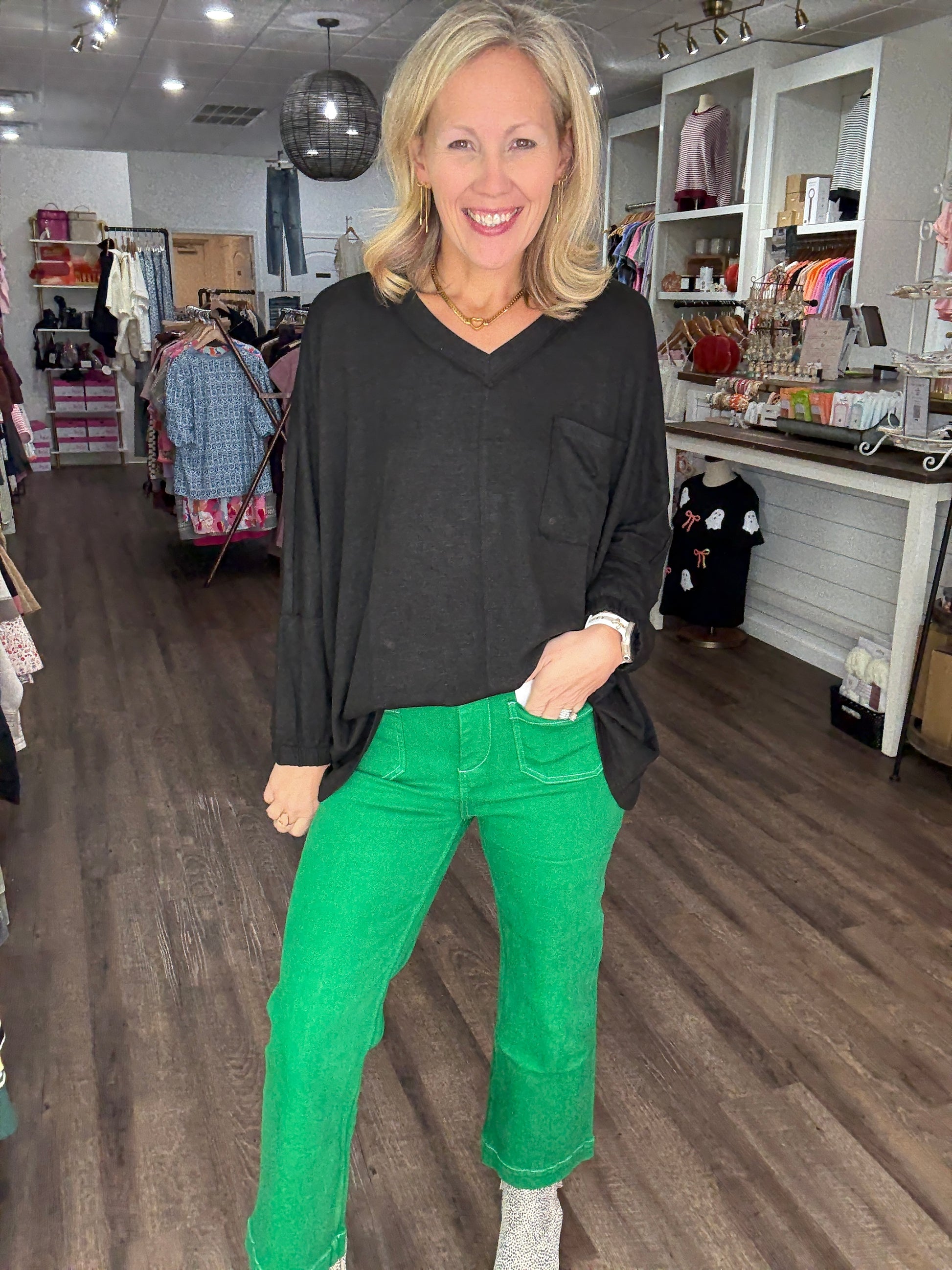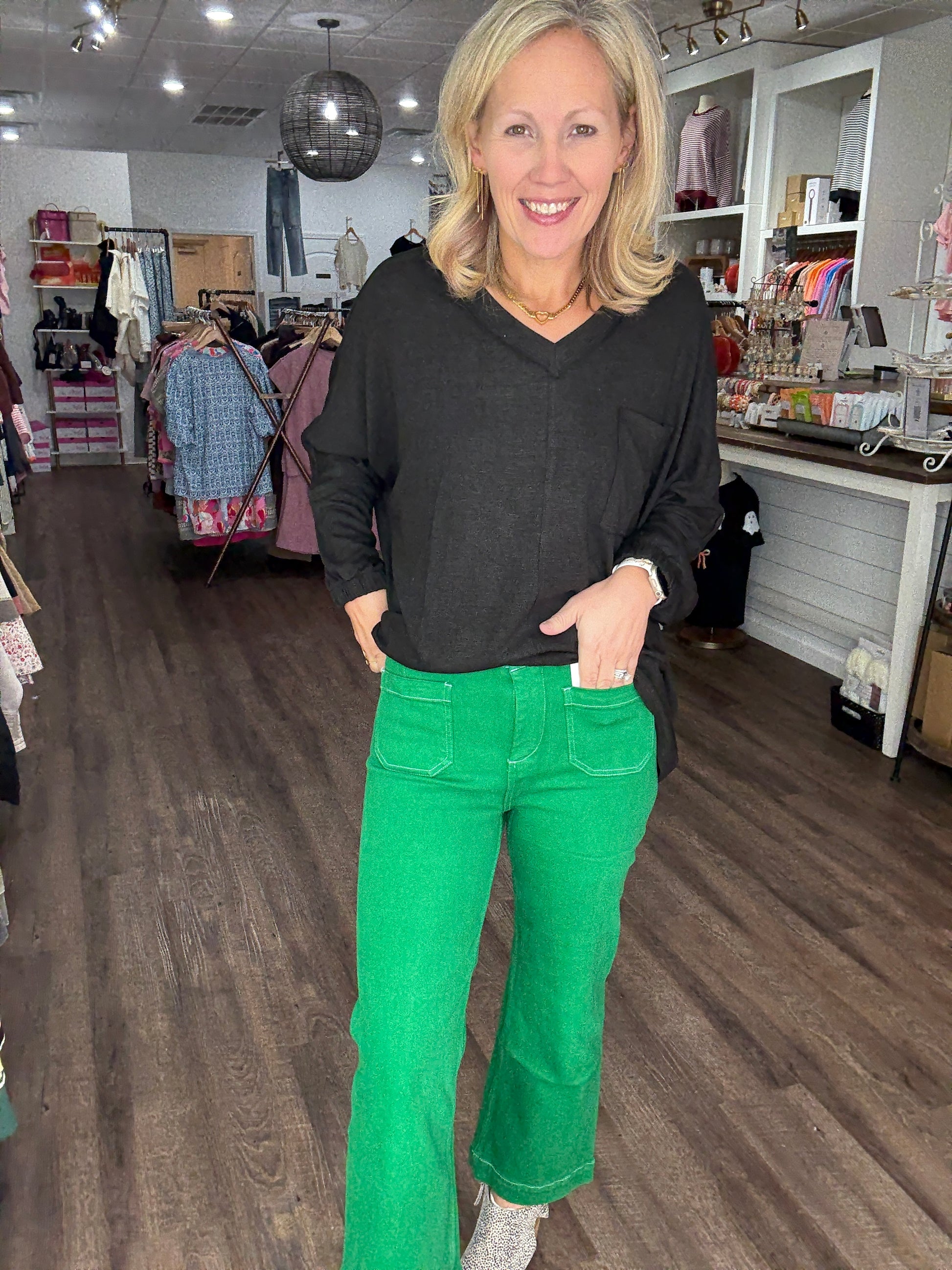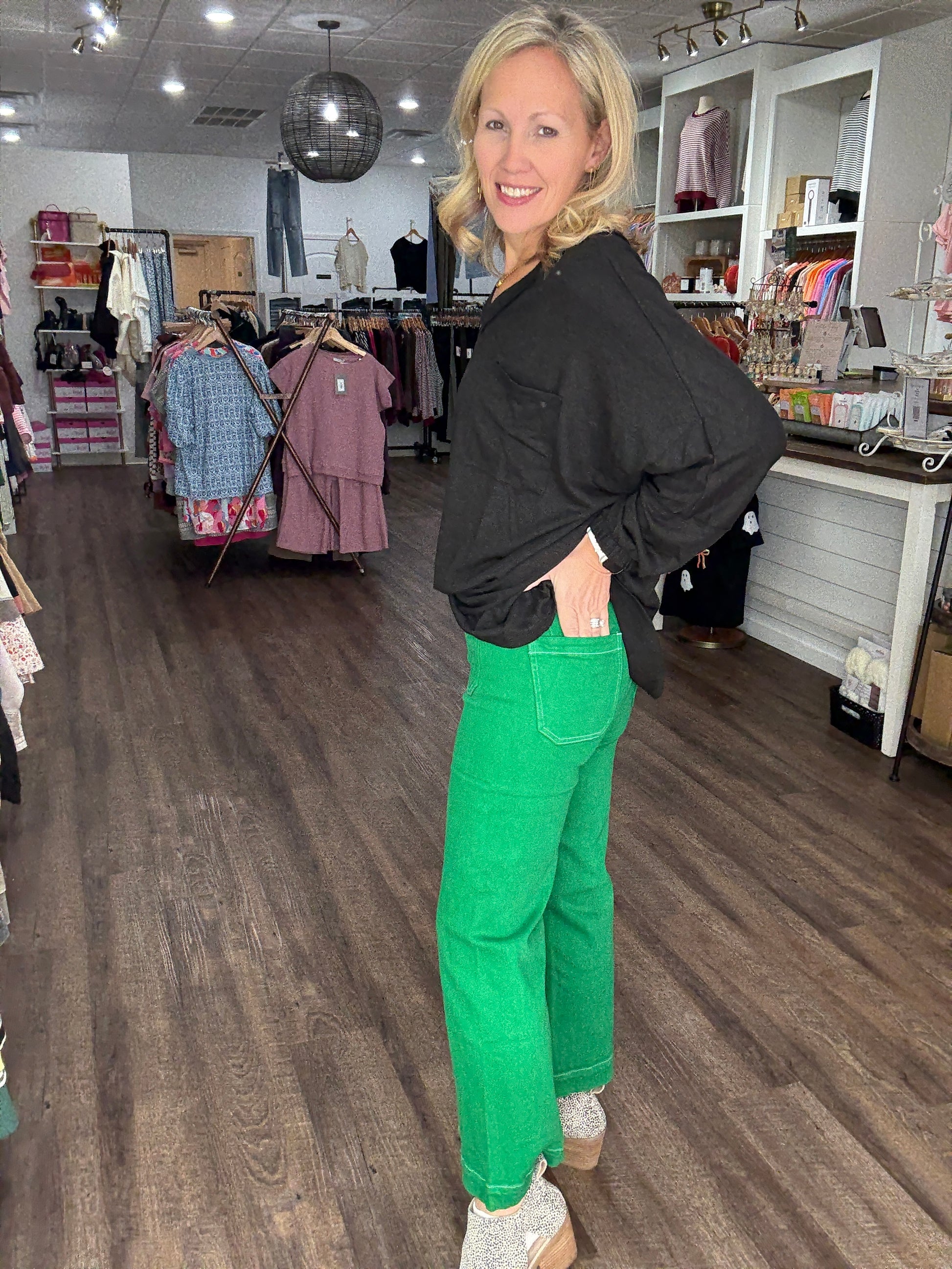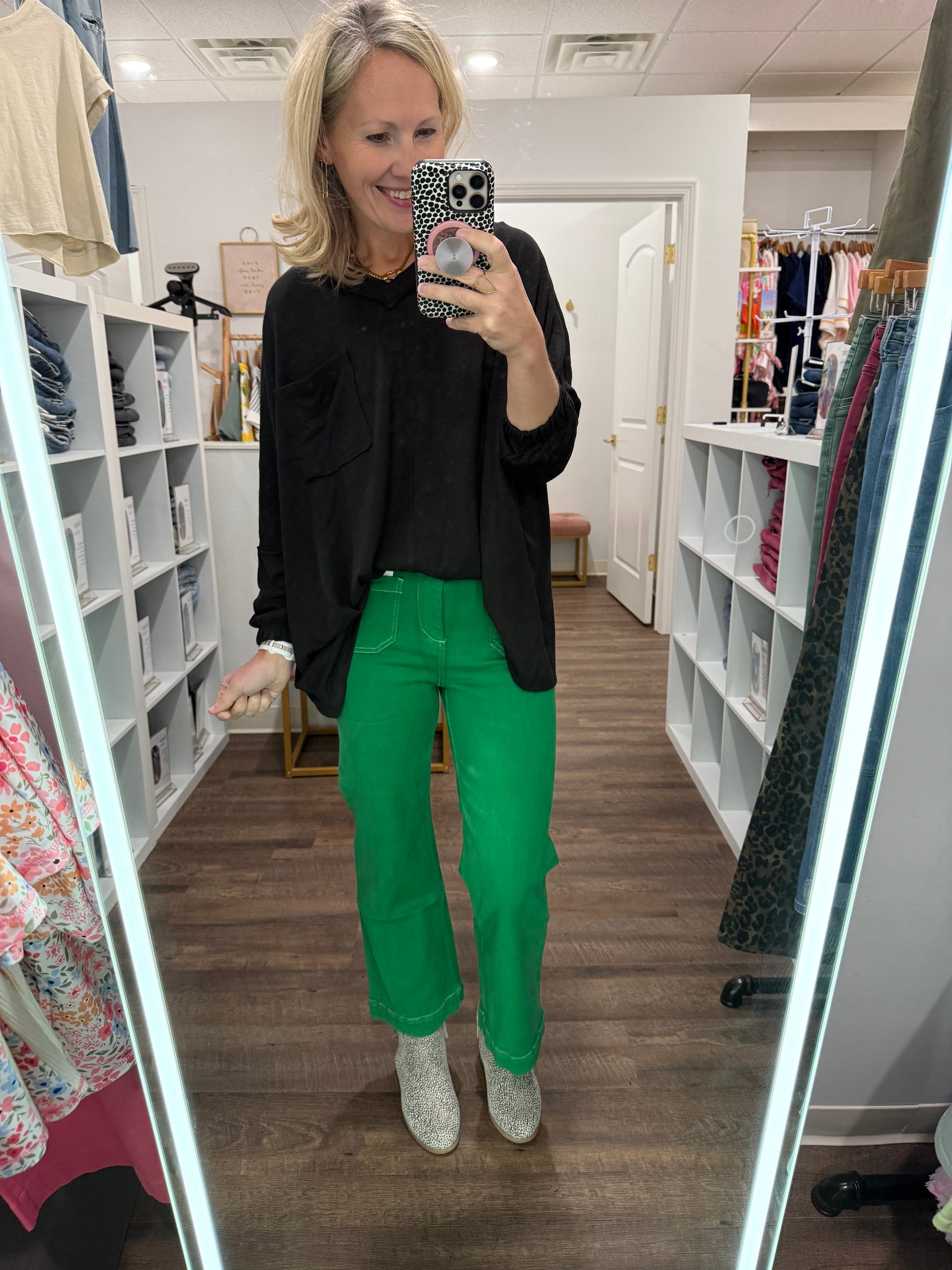 Meet your new statement staple — The Clover Street Crop Denim in that perfect Kelly Green everyone’s been asking for! These beauties have the look of polished dress pants with the comfort and structure of your favorite denim. Made with a soft cotton blend and just the right amount of stretch, they move with you and keep their shape all day.
