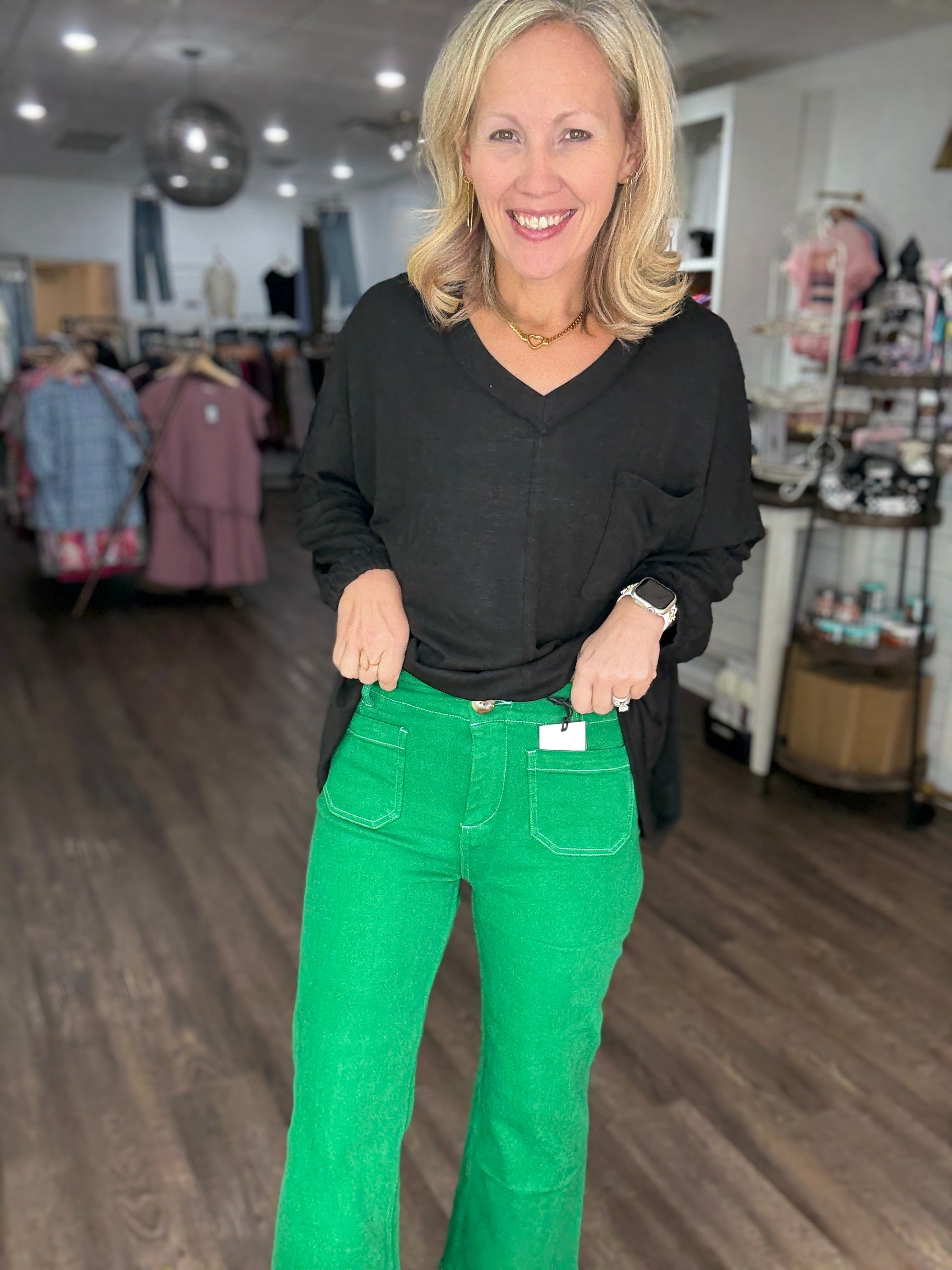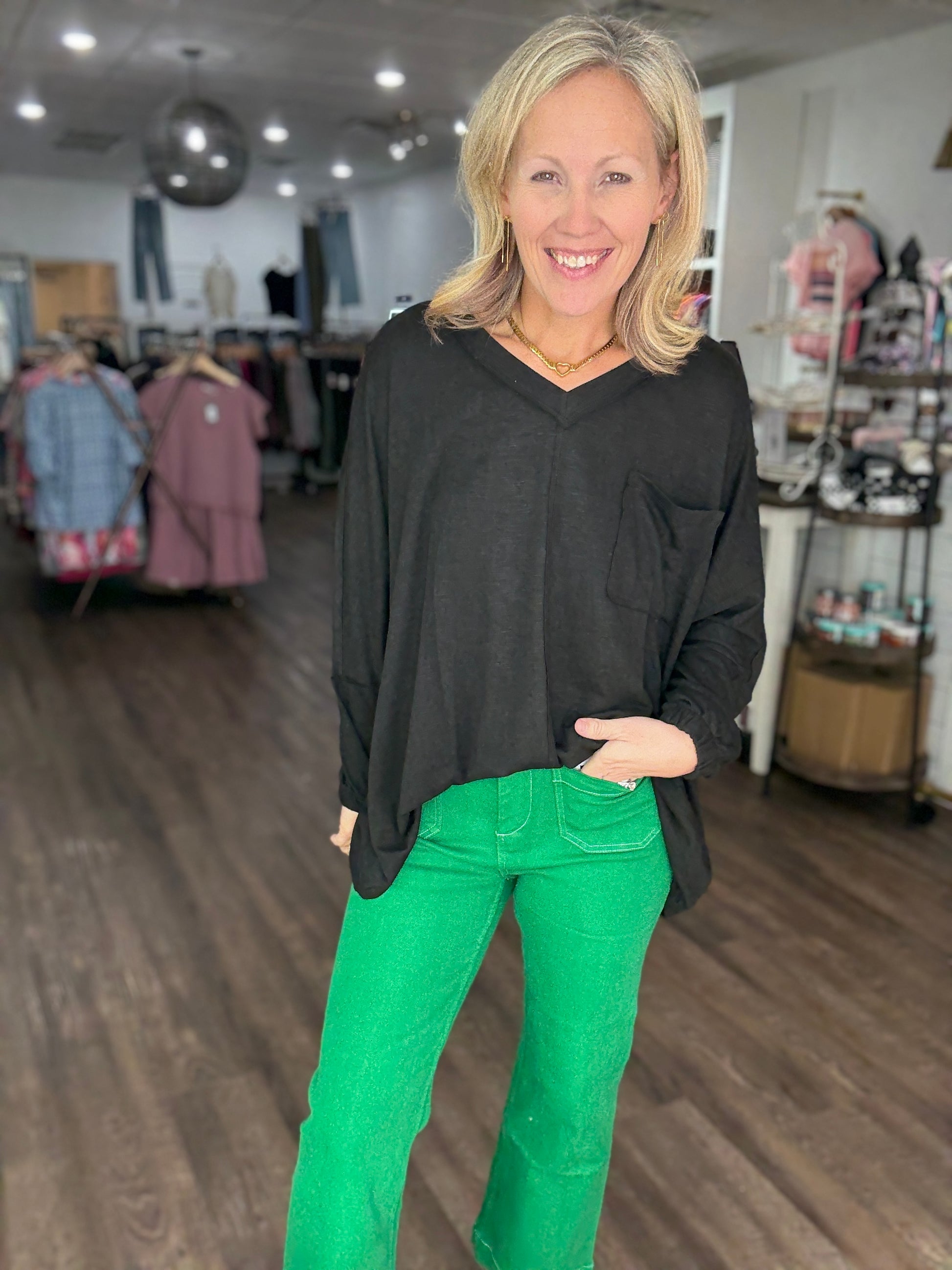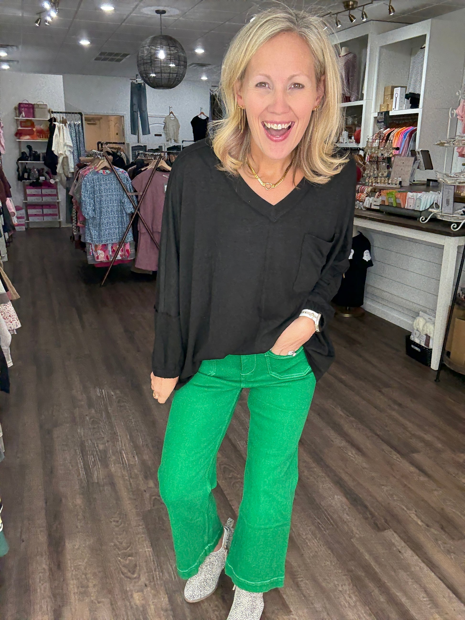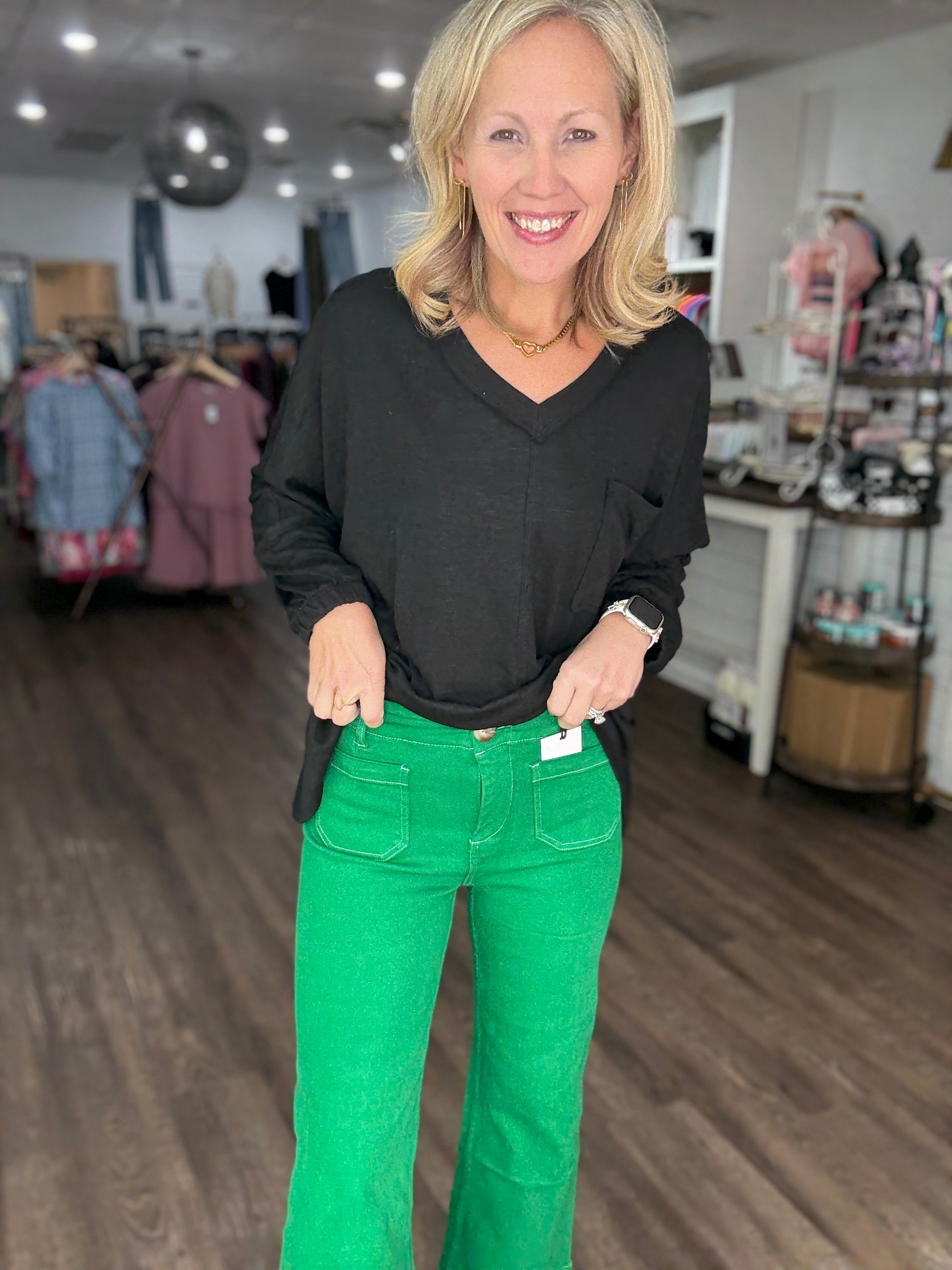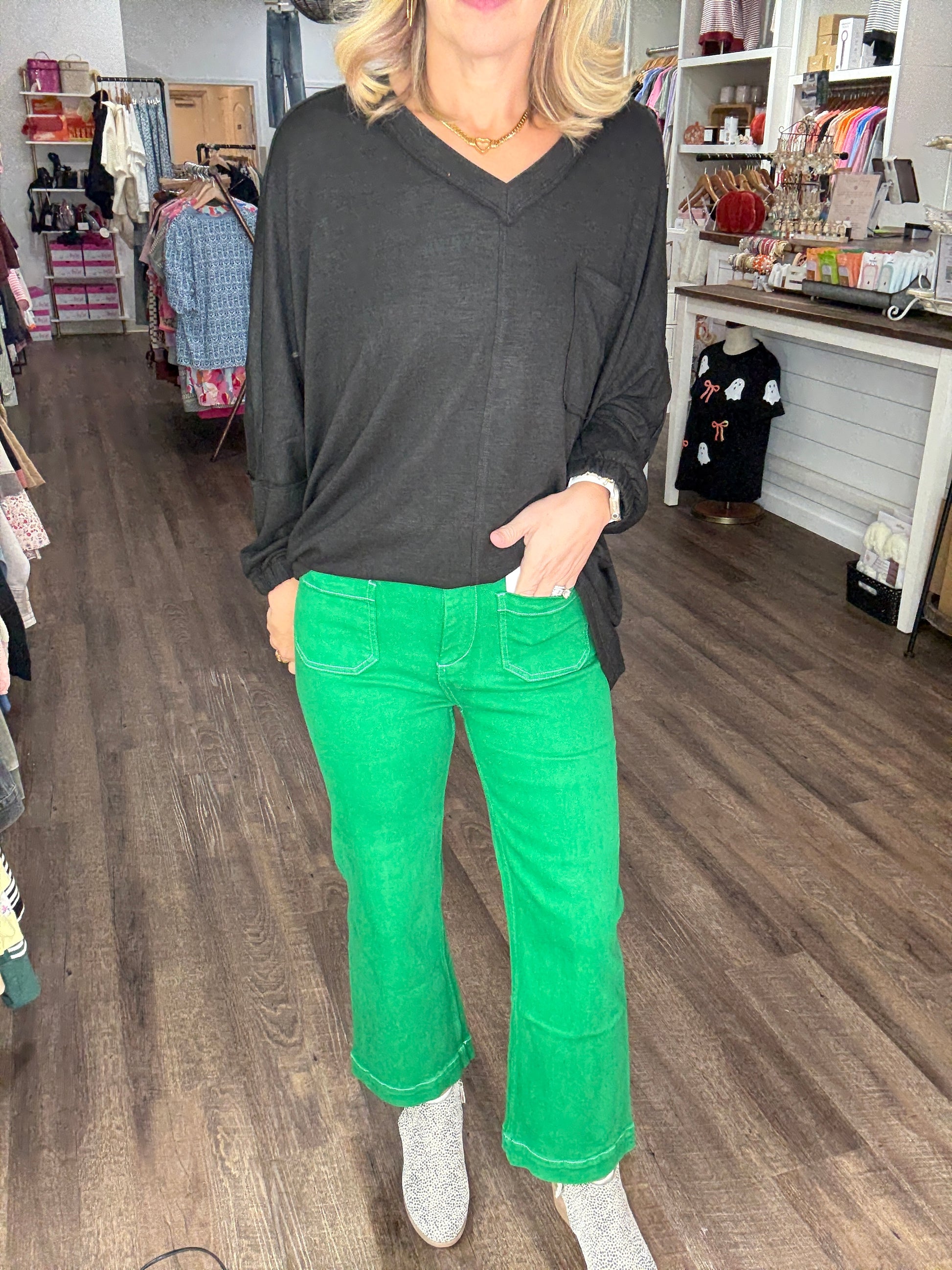 Meet your new statement staple — The Clover Street Crop Denim in that perfect Kelly Green everyone’s been asking for! These beauties have the look of polished dress pants with the comfort and structure of your favorite denim. Made with a soft cotton blend and just the right amount of stretch, they move with you and keep their shape all day.