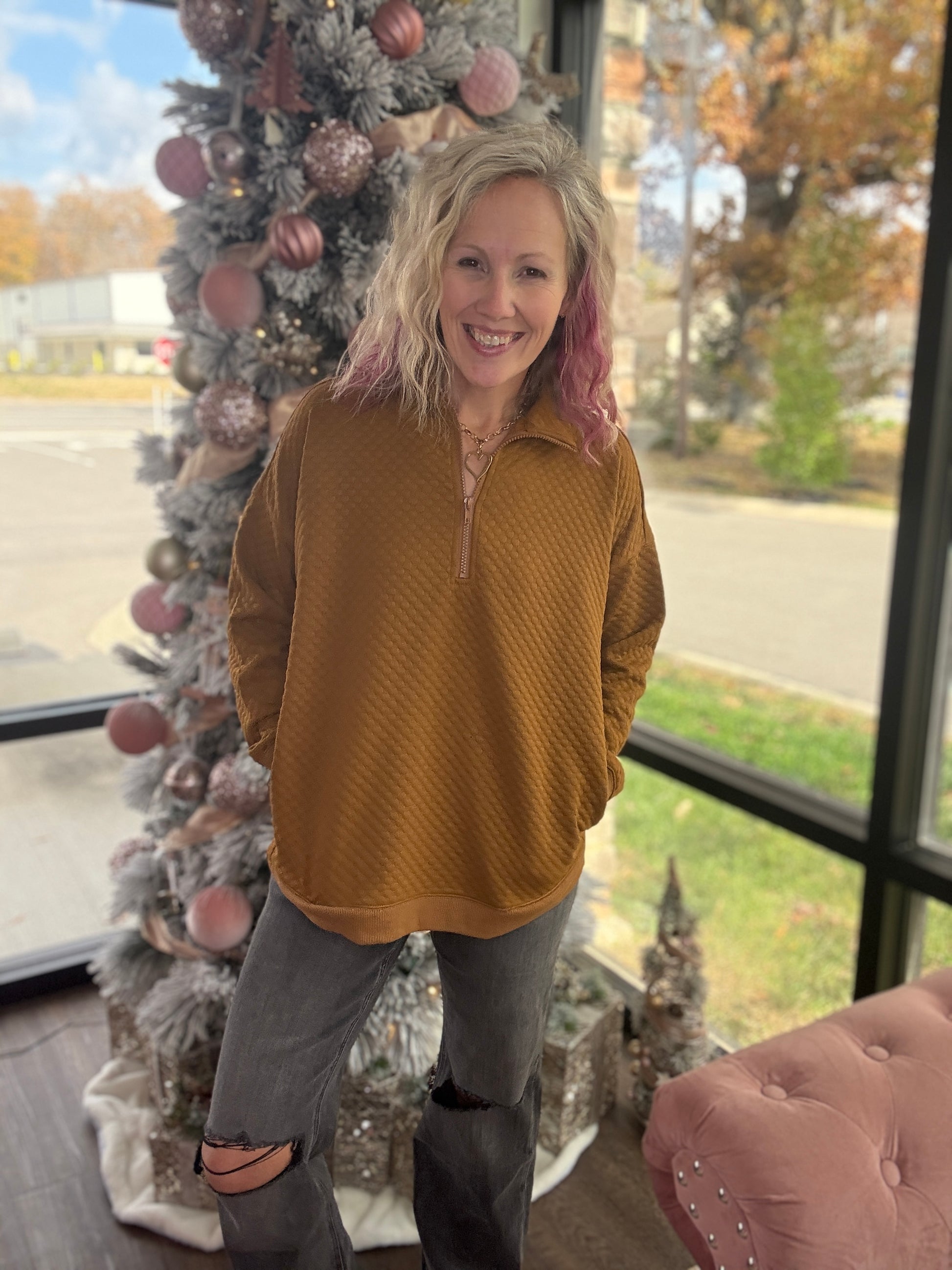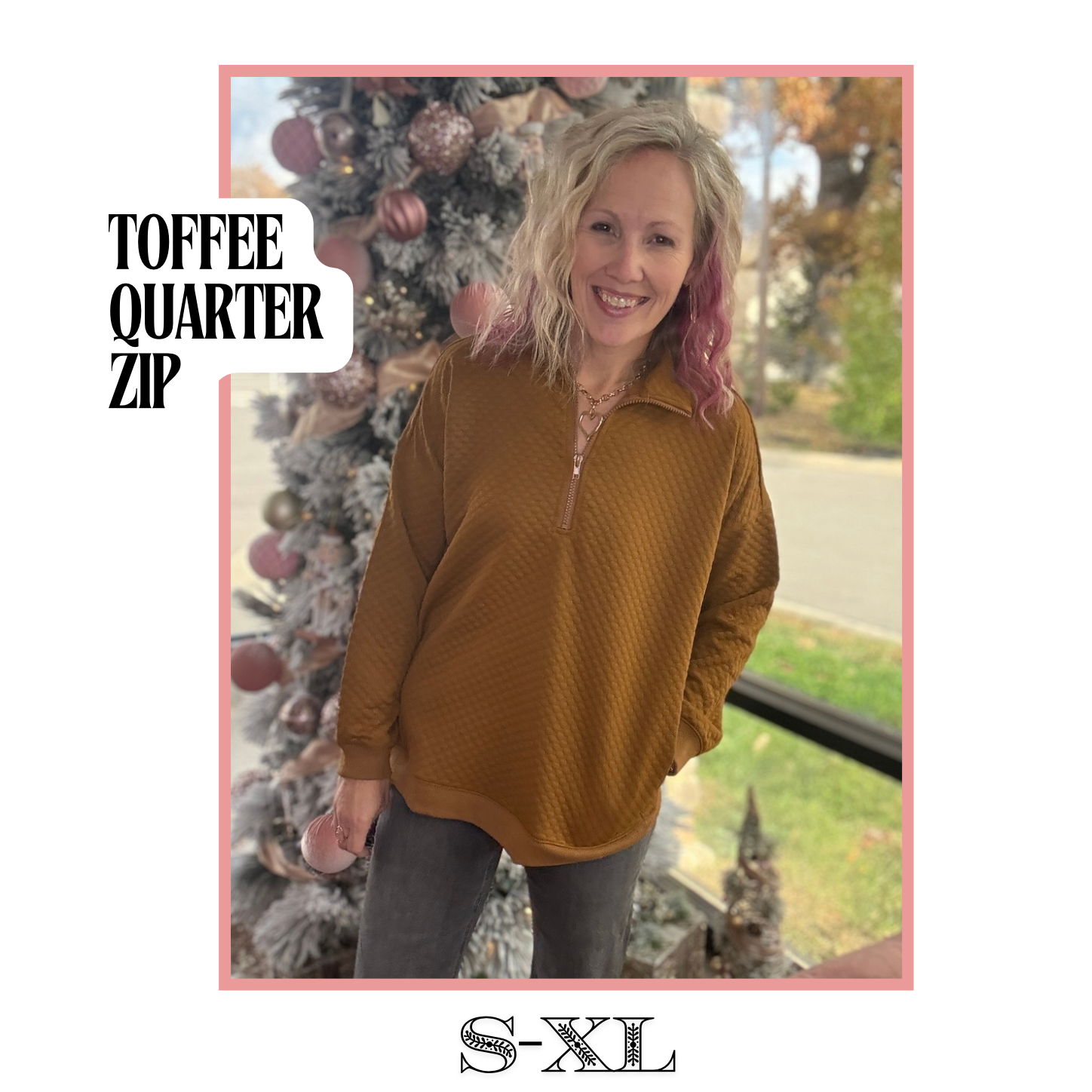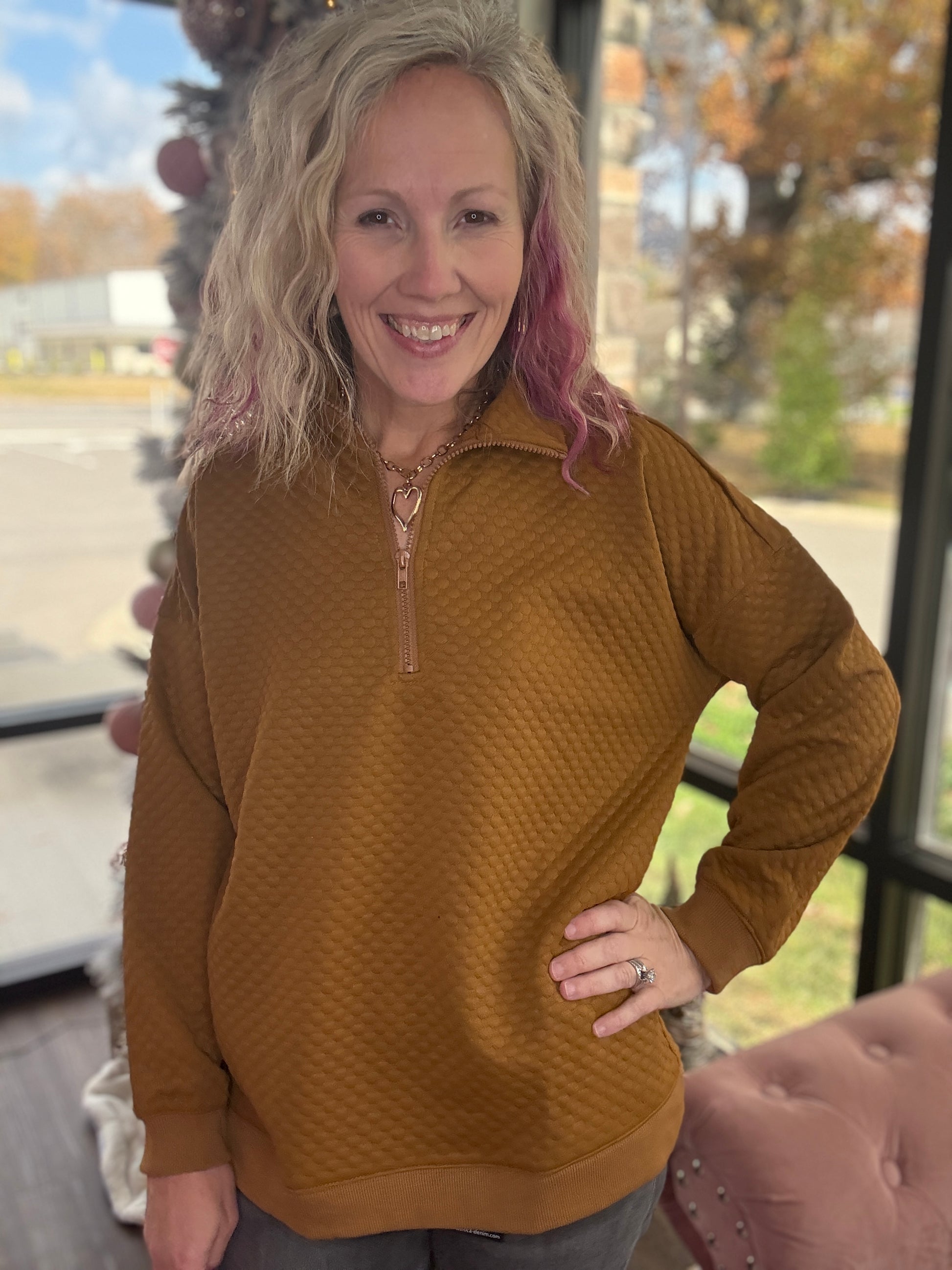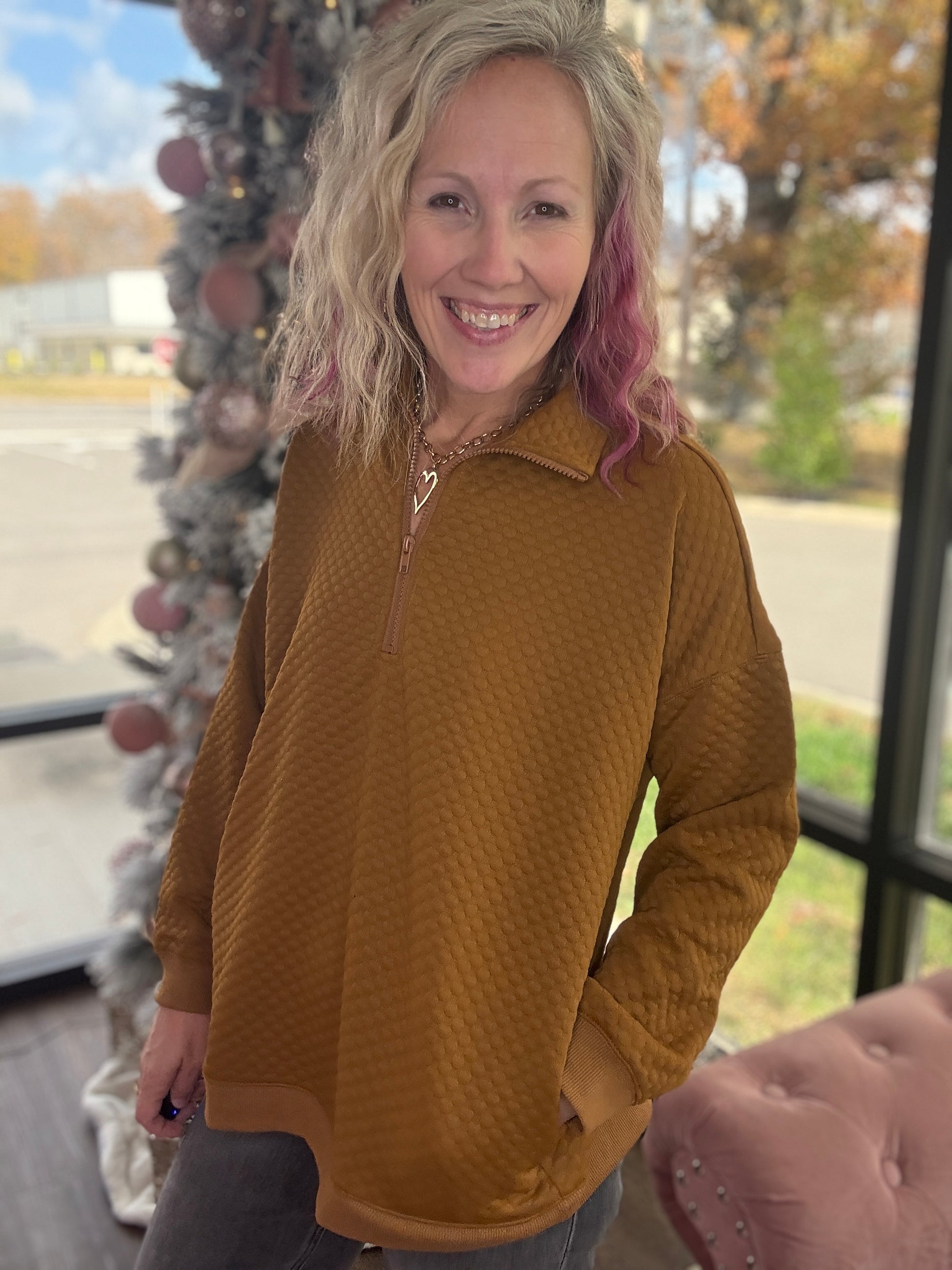 The Toffee Trail Quilted Quarter Zip is your new go-to layer for cozy, cold-weather days. This longer-length pullover features a soft quilted texture in a warm toffee hue, giving you the perfect mix of comfort and seasonal style. The quarter-zip neckline adds versatility, while the side pockets keep things practical and easy. Designed for effortless wear, this pullover pairs beautifully with leggings, denim, or joggers — ideal for fall strolls, winter errands, and everything in between. Warm, comfy, and polished without trying, it’s the piece you’ll reach for again and again.