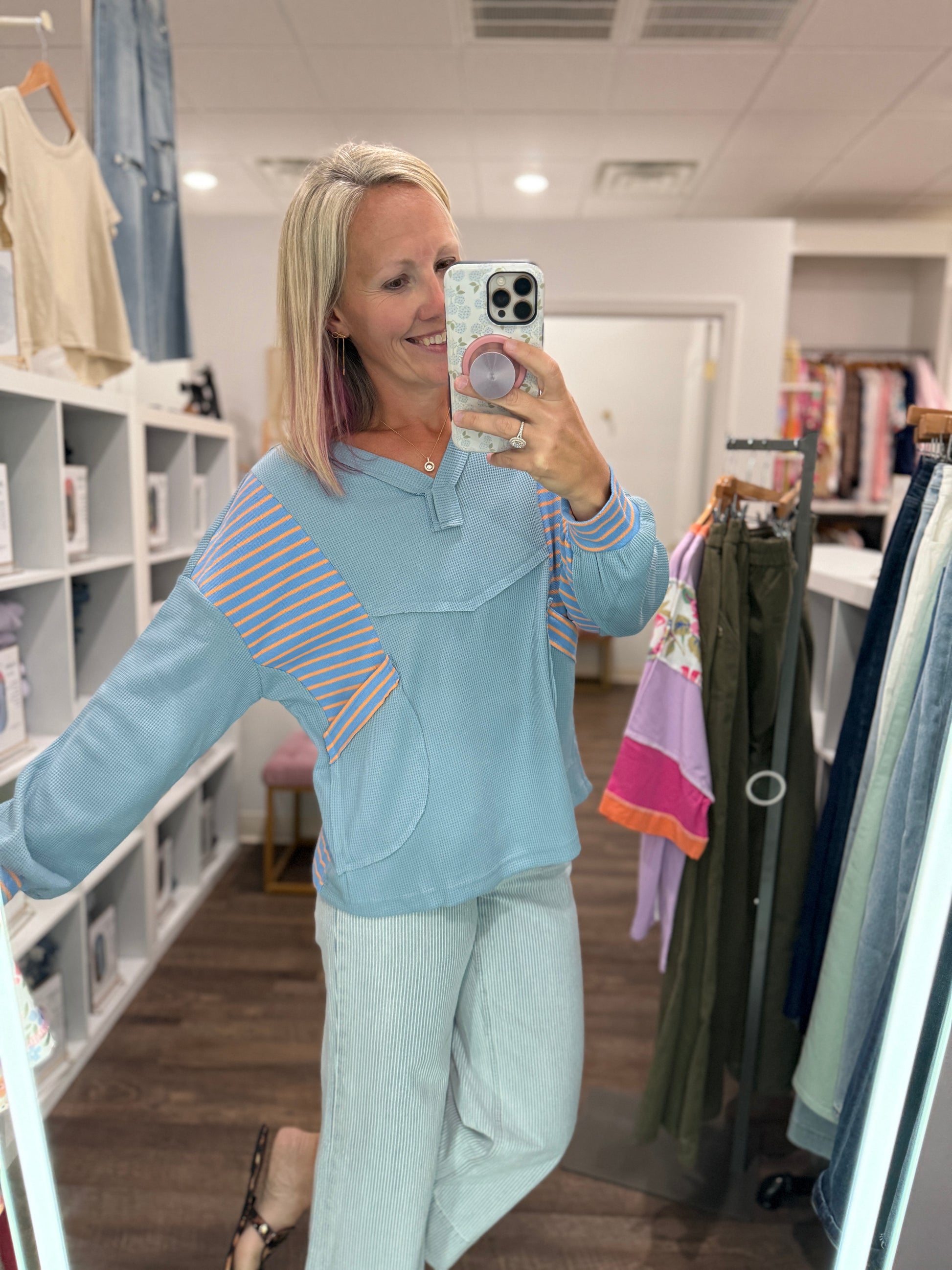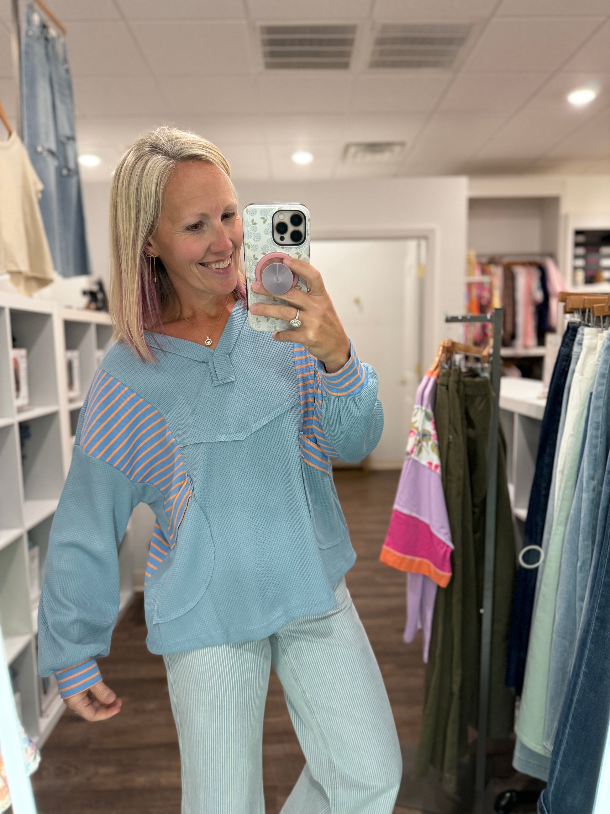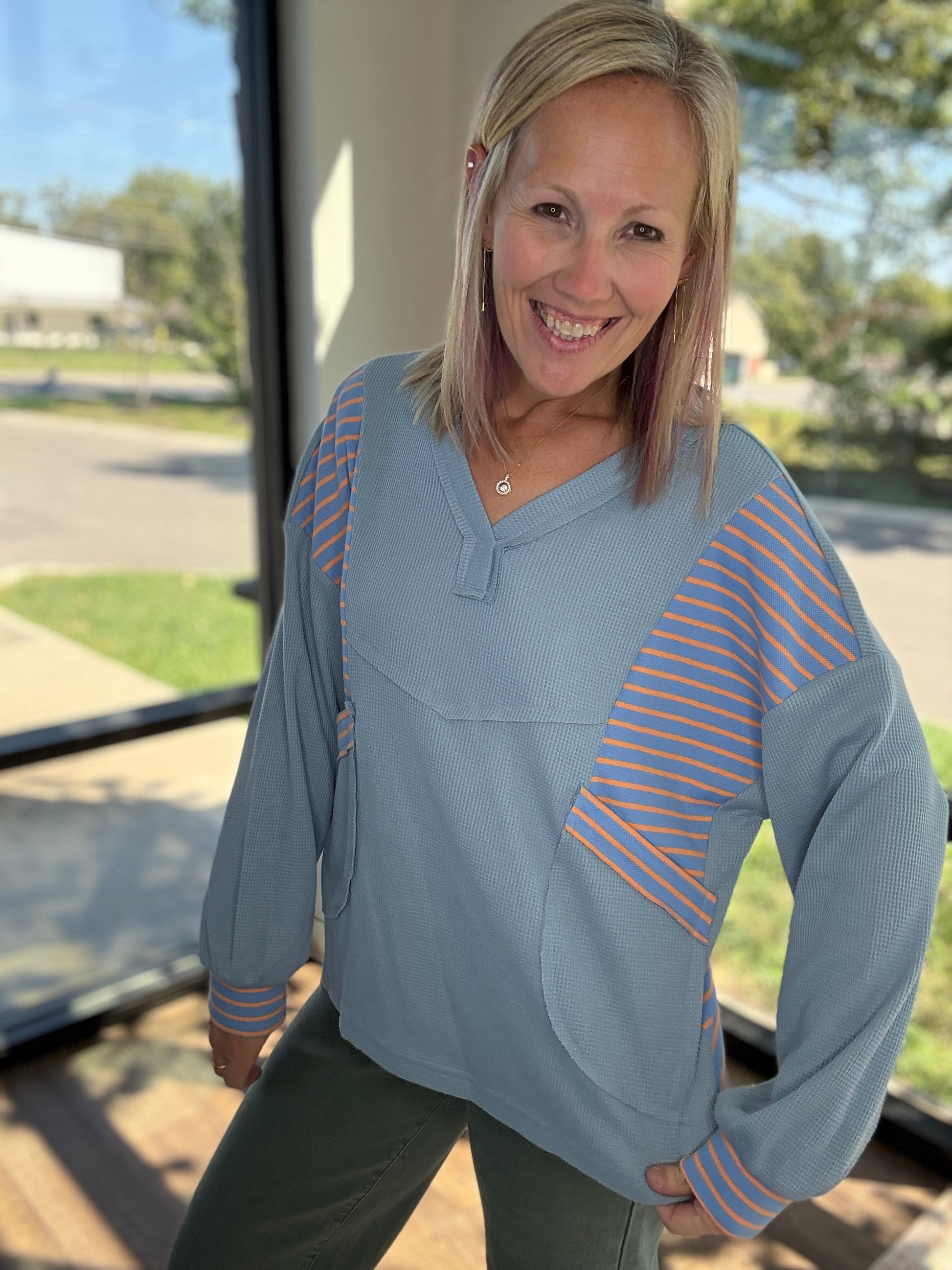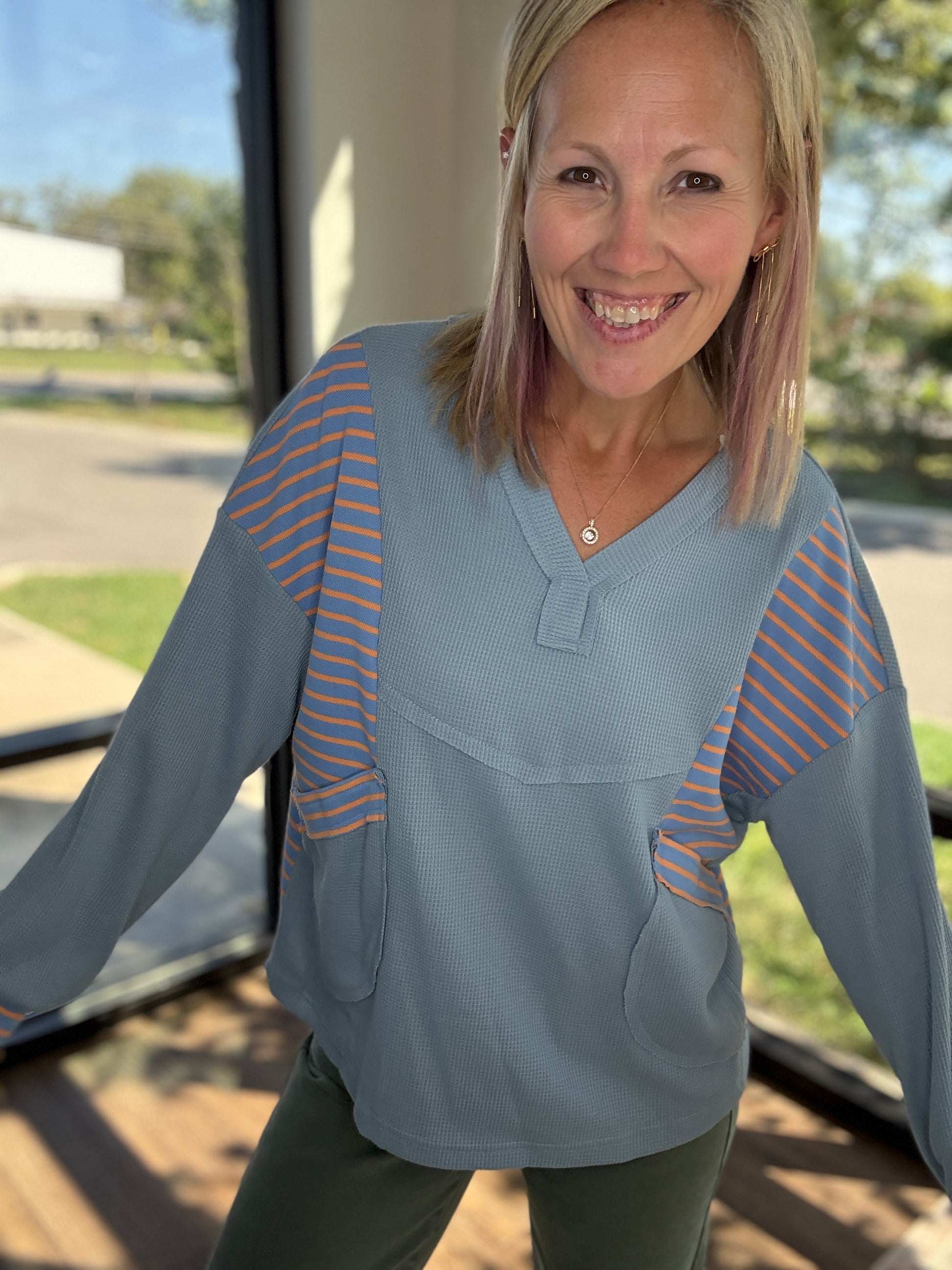 Effortless and ultra-cozy, the Weekend Waffle Top is your new go-anywhere favorite. Crafted from buttery-soft waffle knit, it features playful stripe detailing and roomy oversized front pockets for a relaxed, laid-back vibe. The baggy silhouette drapes perfectly for all-day comfort, whether you’re pairing it with leggings for lounging or jeans for a casual outing. Soft, slouchy, and effortlessly stylish—this is the top you’ll reach for every weekend (and every day in between).