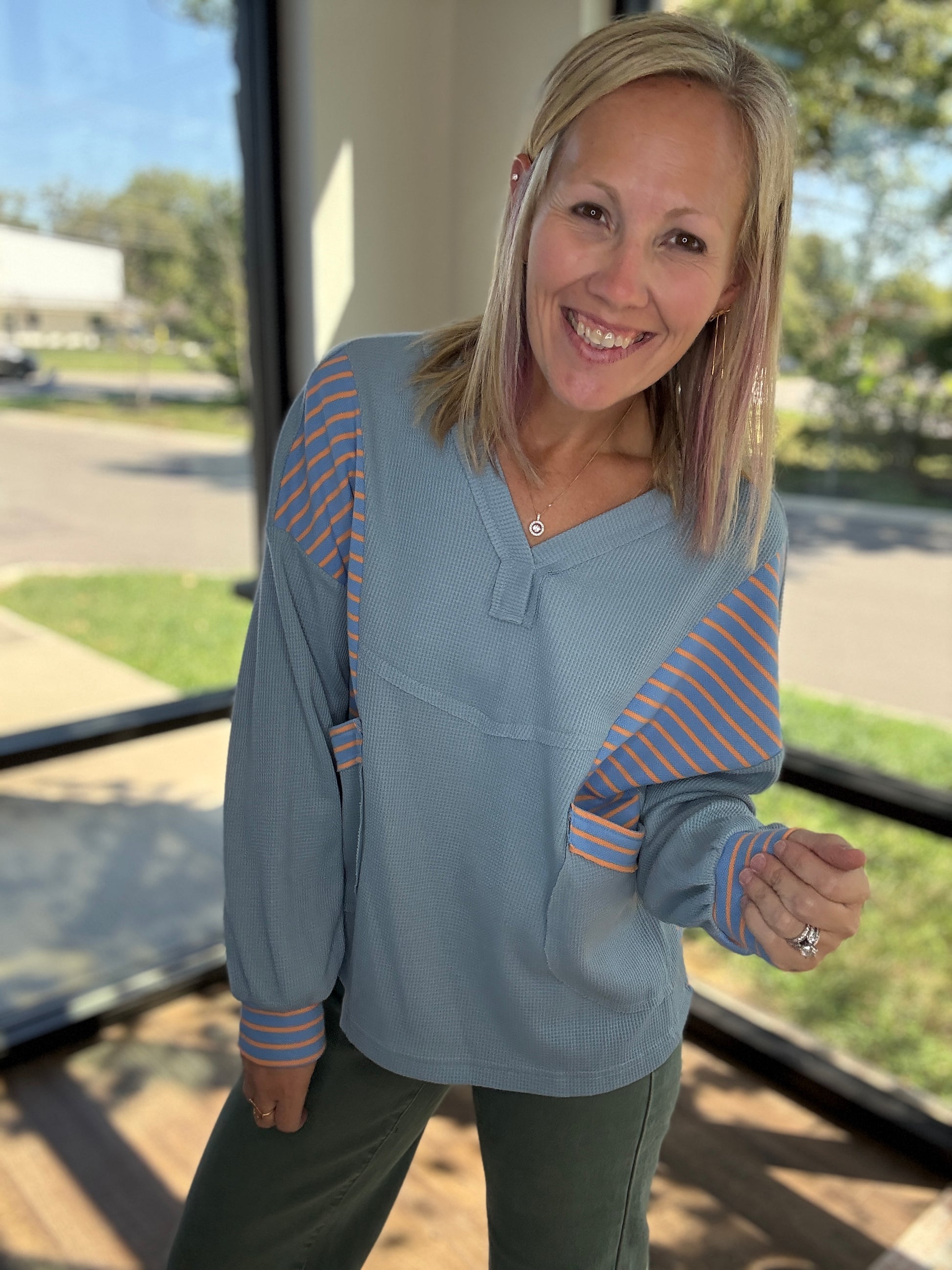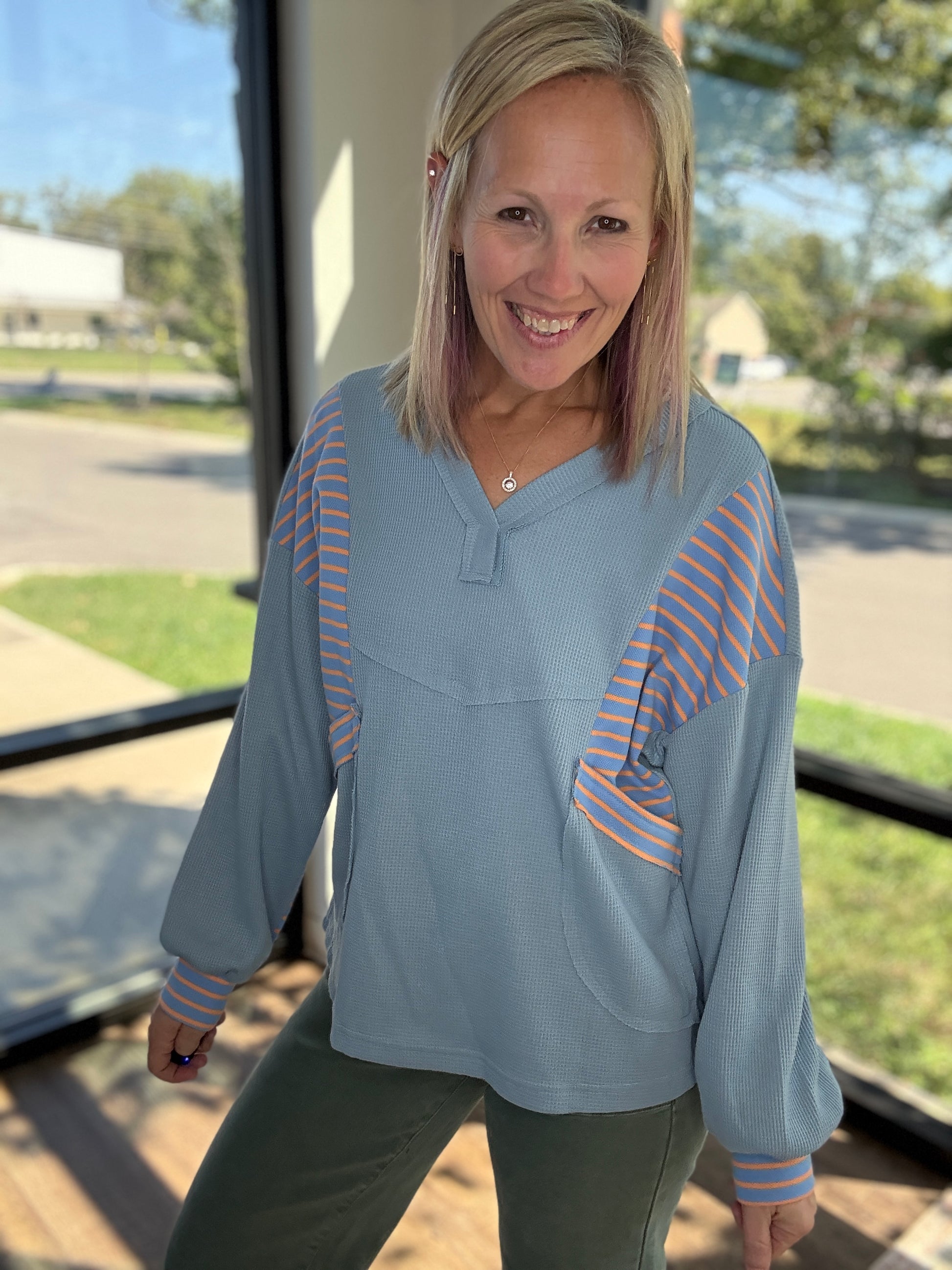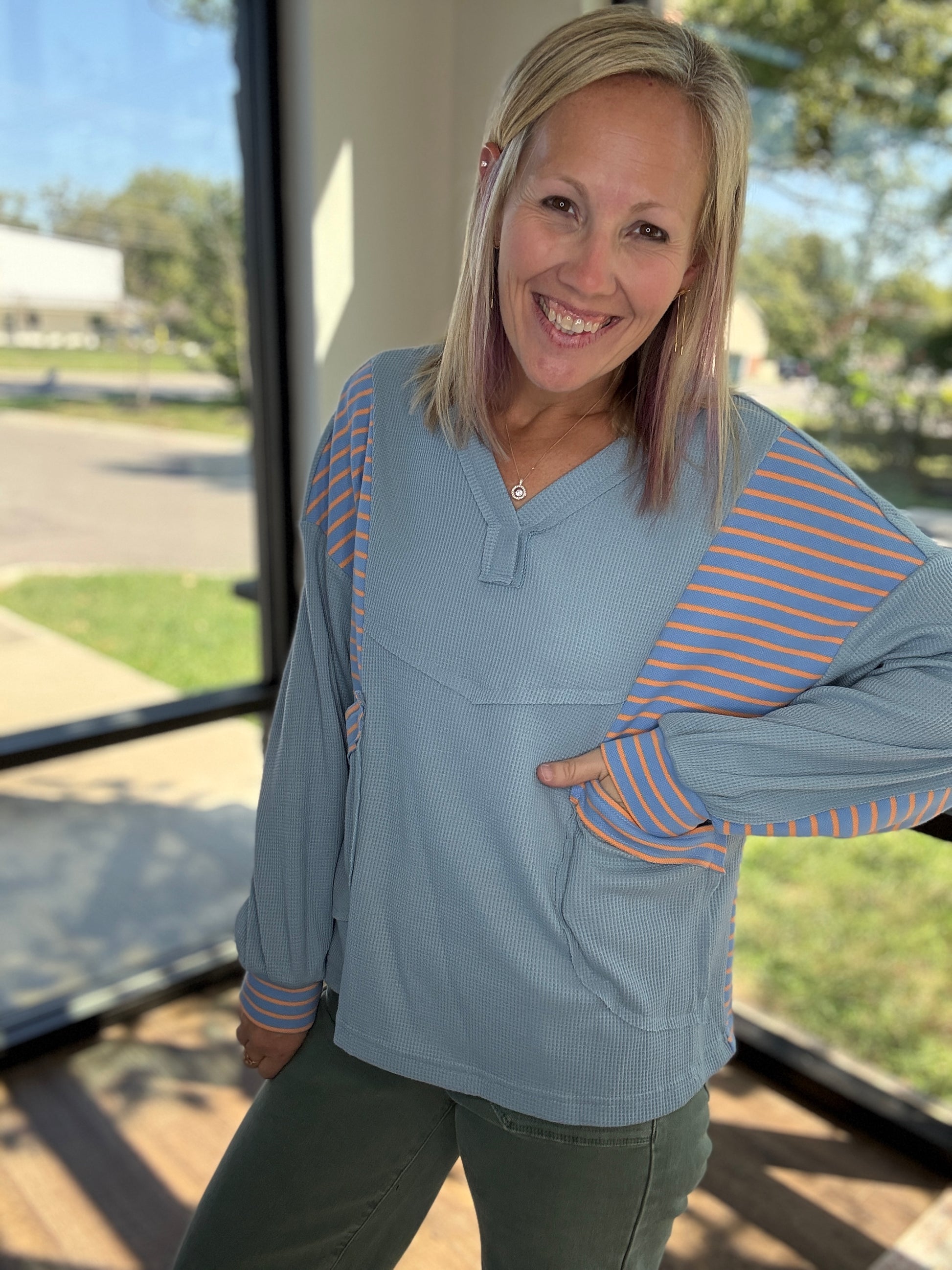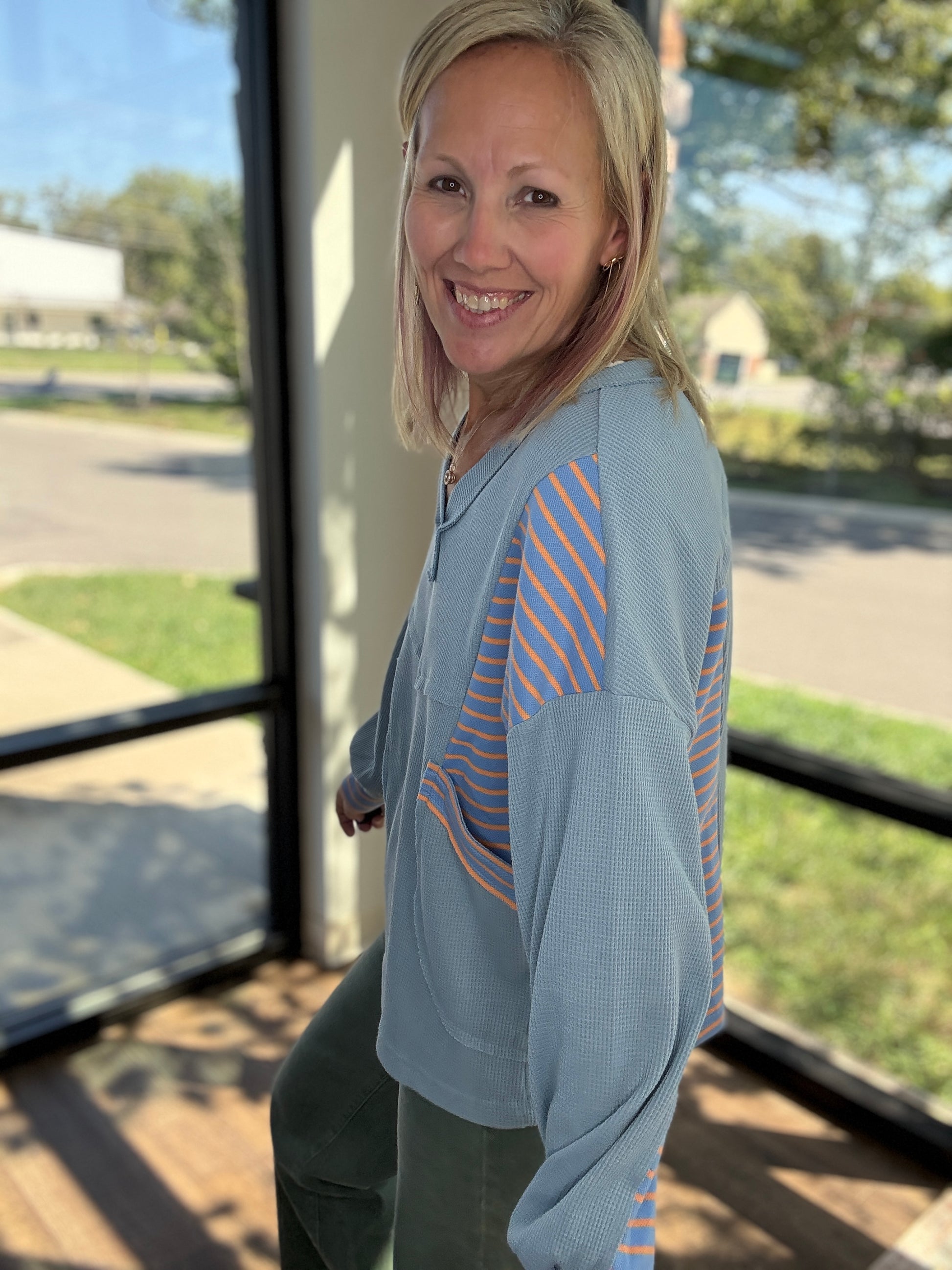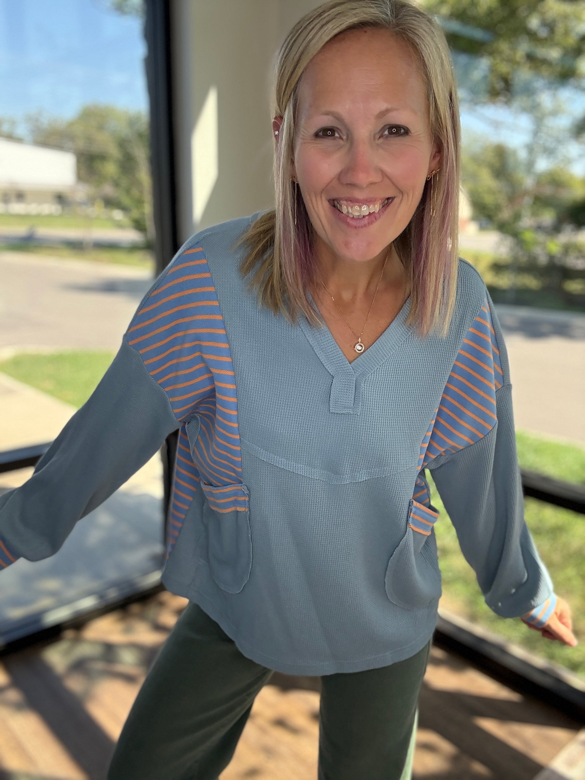 Effortless and ultra-cozy, the Weekend Waffle Top is your new go-anywhere favorite. Crafted from buttery-soft waffle knit, it features playful stripe detailing and roomy oversized front pockets for a relaxed, laid-back vibe. The baggy silhouette drapes perfectly for all-day comfort, whether you’re pairing it with leggings for lounging or jeans for a casual outing. Soft, slouchy, and effortlessly stylish—this is the top you’ll reach for every weekend (and every day in between).