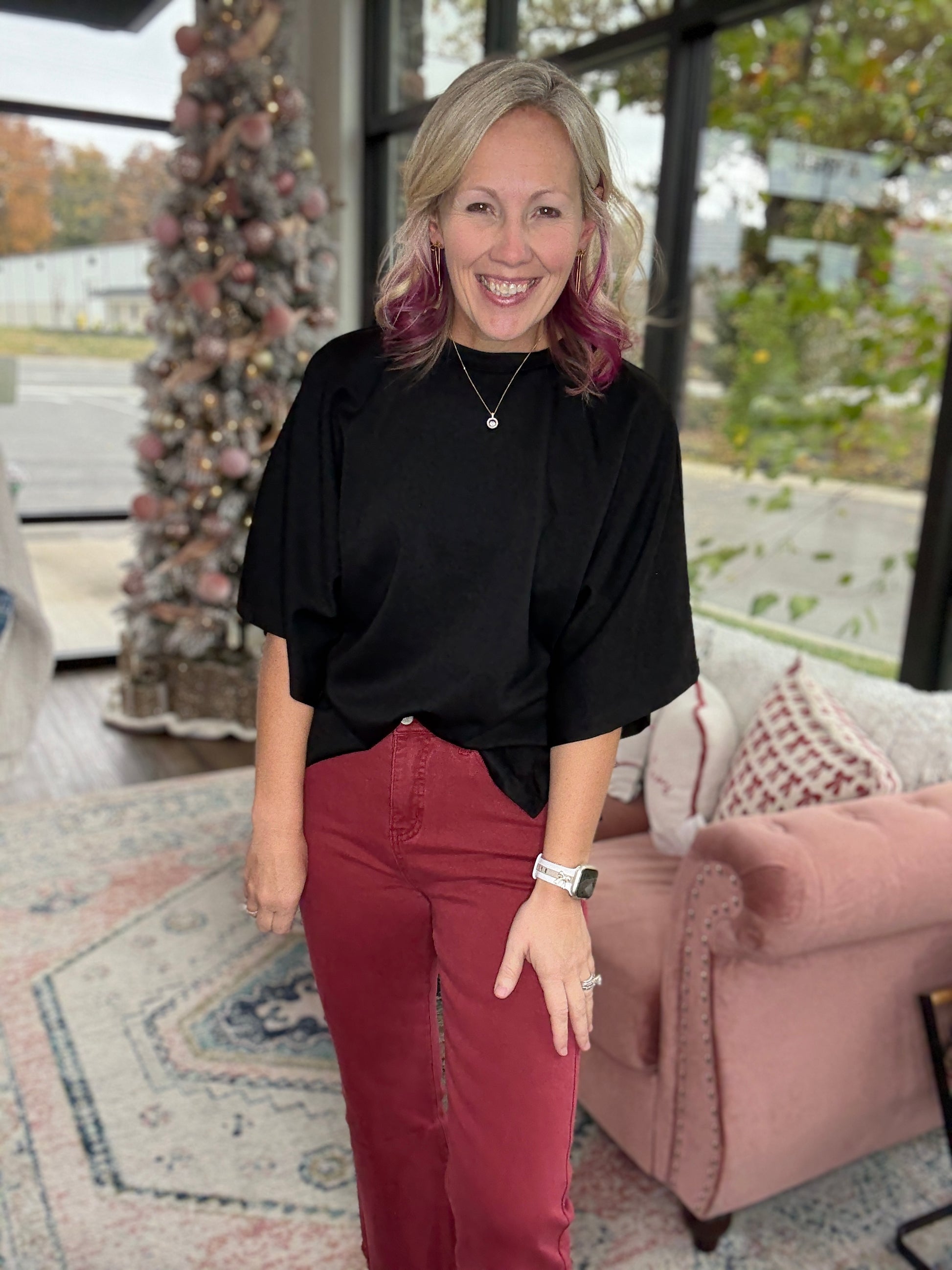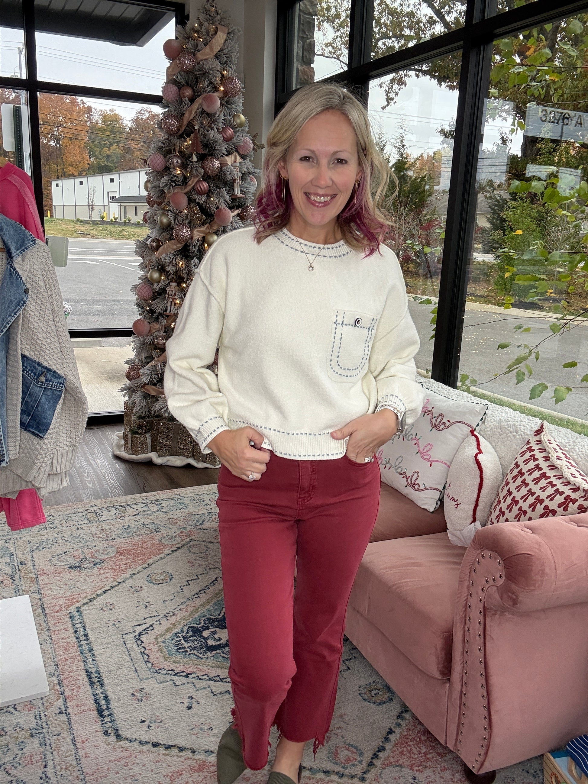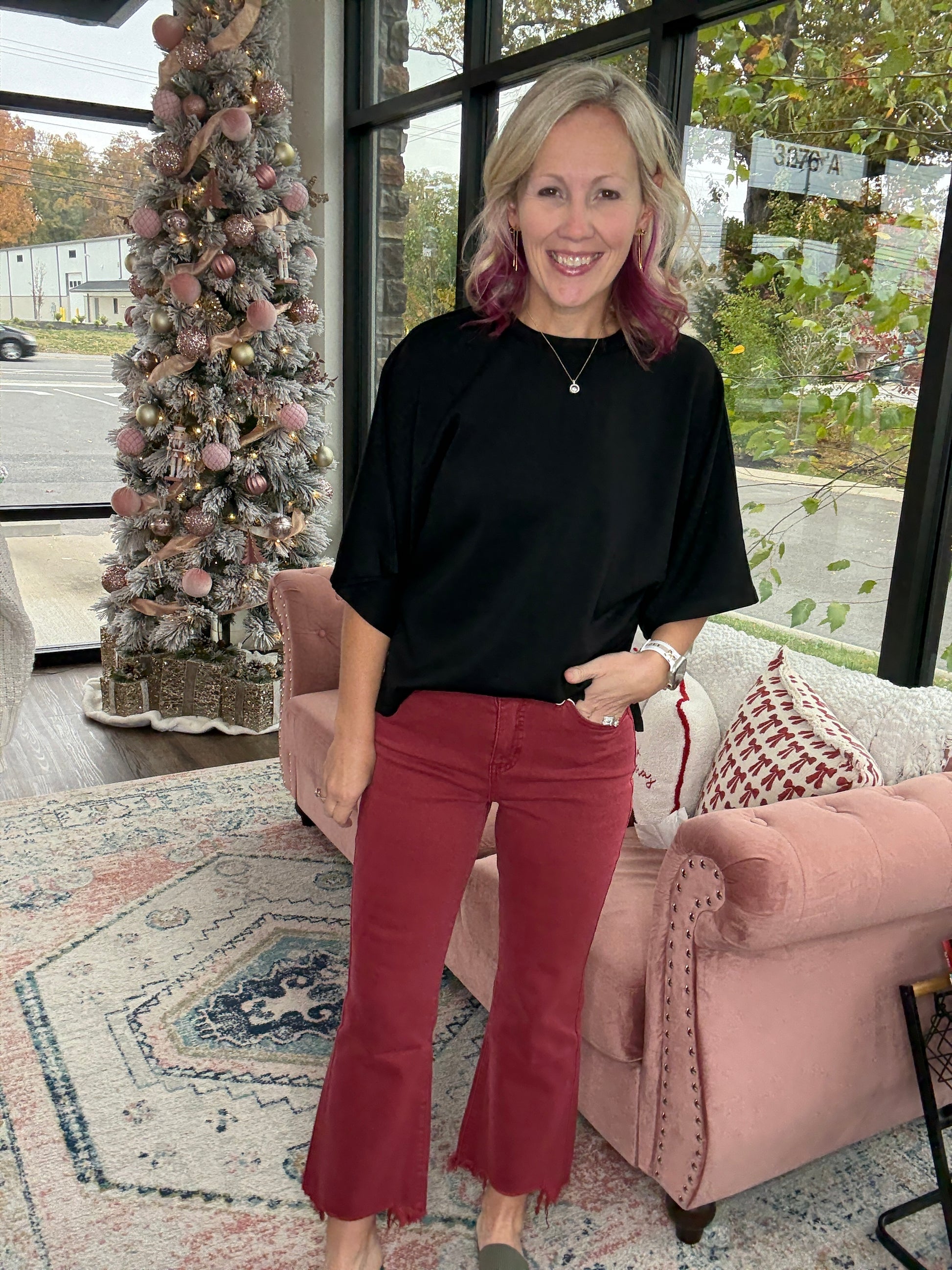 Our best-selling Blakeley Denim is back in the perfect burgundy wine shade for fall – and now without distressing. So many of you asked for this same fit and fabric with a clean knee, and here it is.